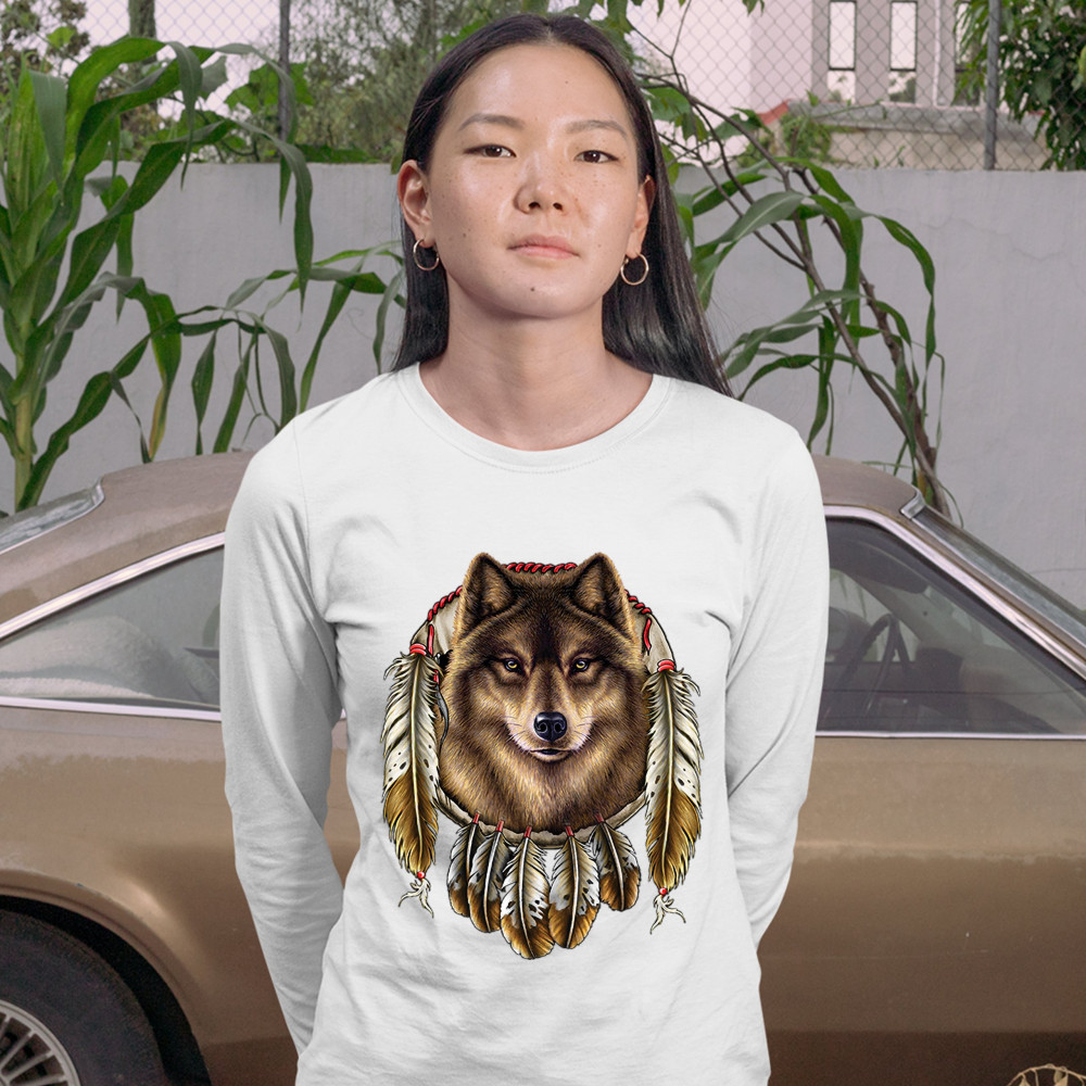 WOLF SPIRIT women's long sleeve t-shirt native american dreamcatcher indigenous white