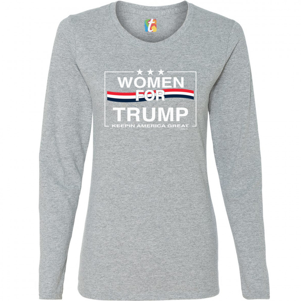 A political print saying "Women for Trump keepin America great". There are three stars above the caption and in the background there is a three-colored stripe. A great choice to wear for a Trump rally or give as a gift to a Donald Trump and Mike Pence supporter before 2020 presidential elections.