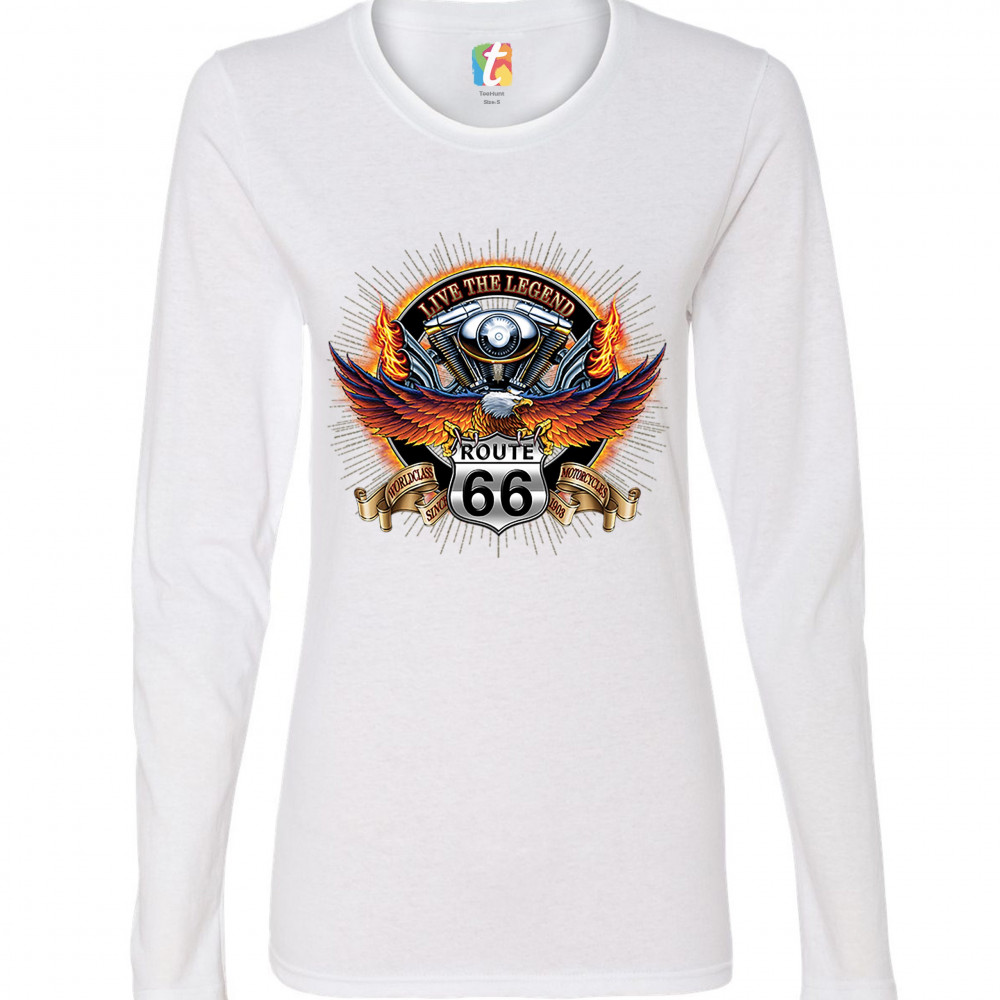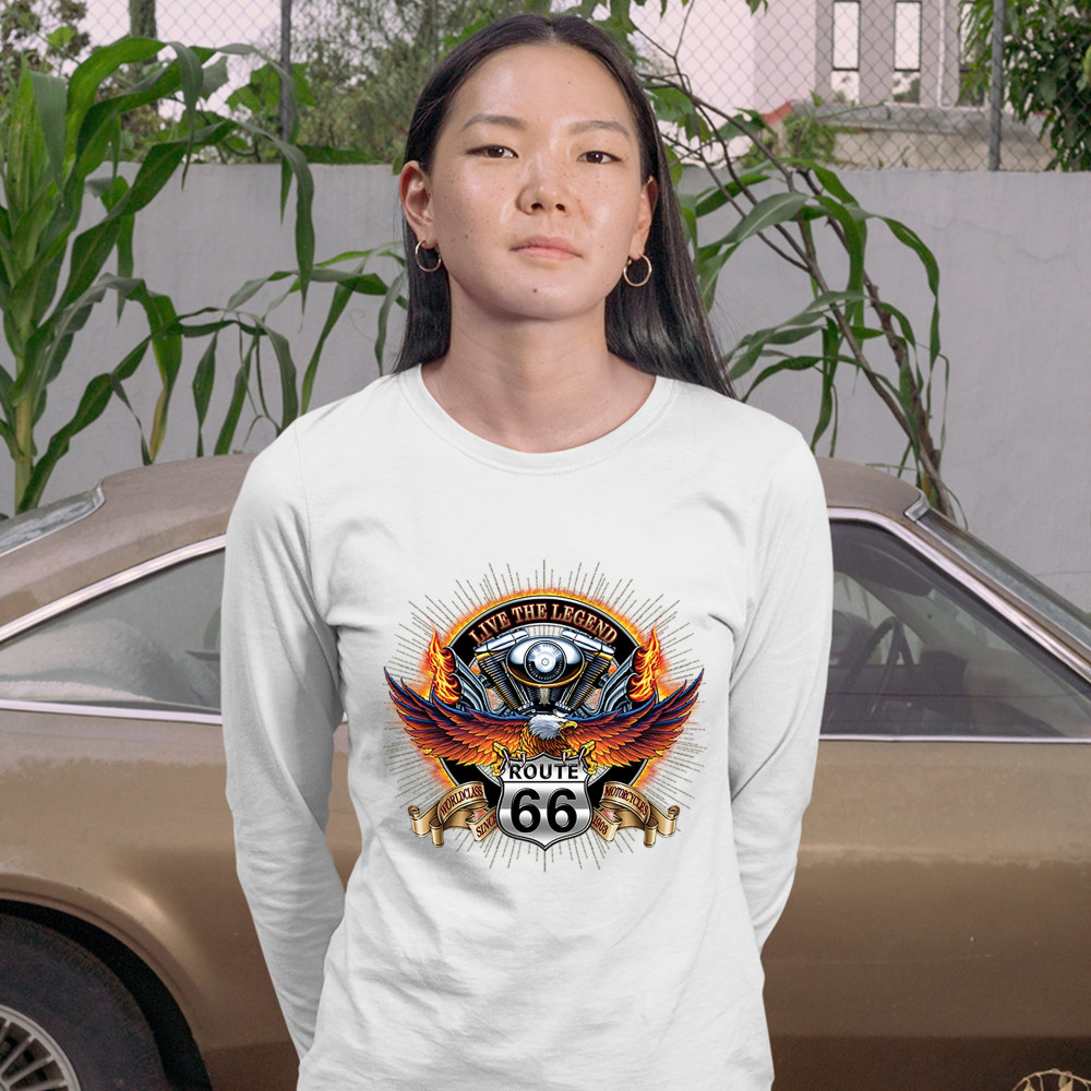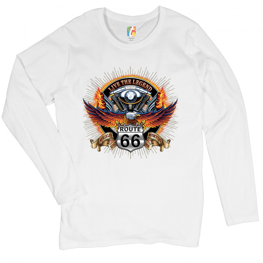 A print featuring an American bald eagle spreading it's wings while sitting on a "Route 66" sign. On a stripe behind the sign it says: "worldclass motorcycles since 1903". In the background there is a motorcycle engine with words: "live the legend" above