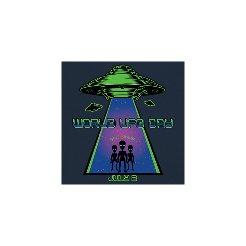 Join the celebration of World UFO Day with this unique design, featuring a detailed UFO beaming up three cheerful aliens with the phrase "Get in, loser." Perfect for those who are fascinated by the unknown and have a sense of humor about extraterrestrial life. Whether you're attending a UFO event, meeting with fellow enthusiasts, or just want to express your quirky style, this design is a must-have. Embrace the spirit of curiosity and fun with this eye-catching design for July 2nd.
