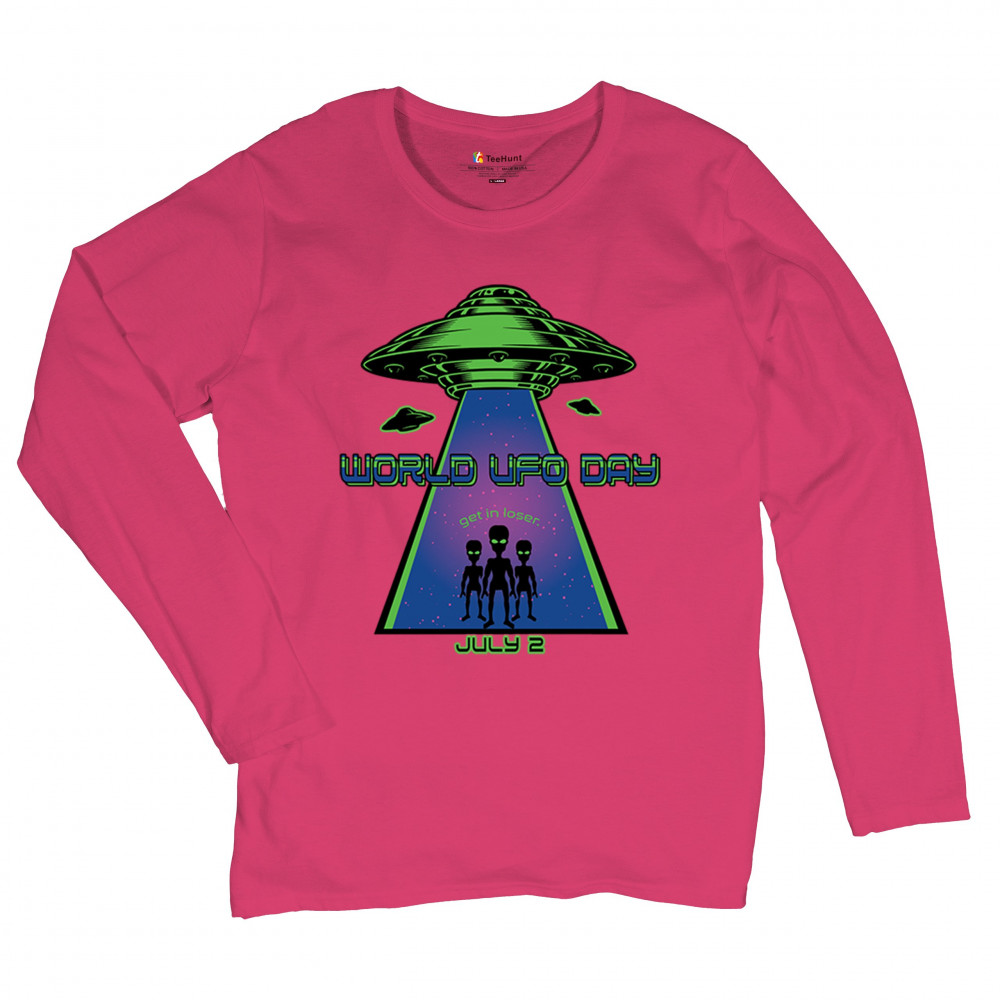 Celebrate World UFO Day with a vibrant design featuring a UFO and three playful aliens with "Get in, loser." Perfect for UFO enthusiasts and alien humor lovers.