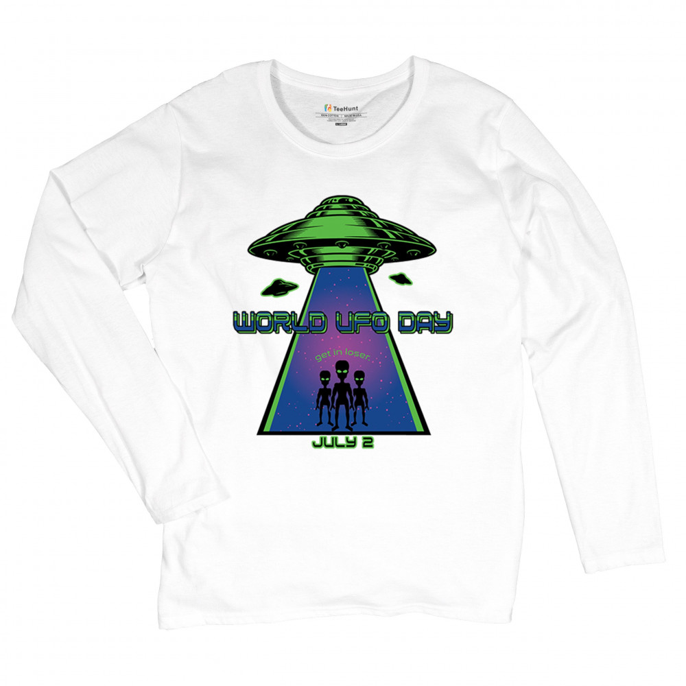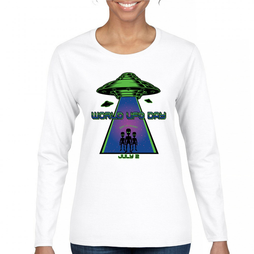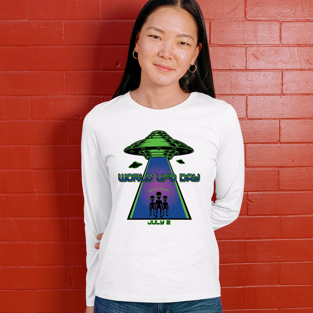Join the celebration of World UFO Day with this unique design, featuring a detailed UFO beaming up three cheerful aliens with the phrase "Get in, loser." Perfect for those who are fascinated by the unknown and have a sense of humor about extraterrestrial life. Whether you're attending a UFO event, meeting with fellow enthusiasts, or just want to express your quirky style, this design is a must-have. Embrace the spirit of curiosity and fun with this eye-catching design for July 2nd.