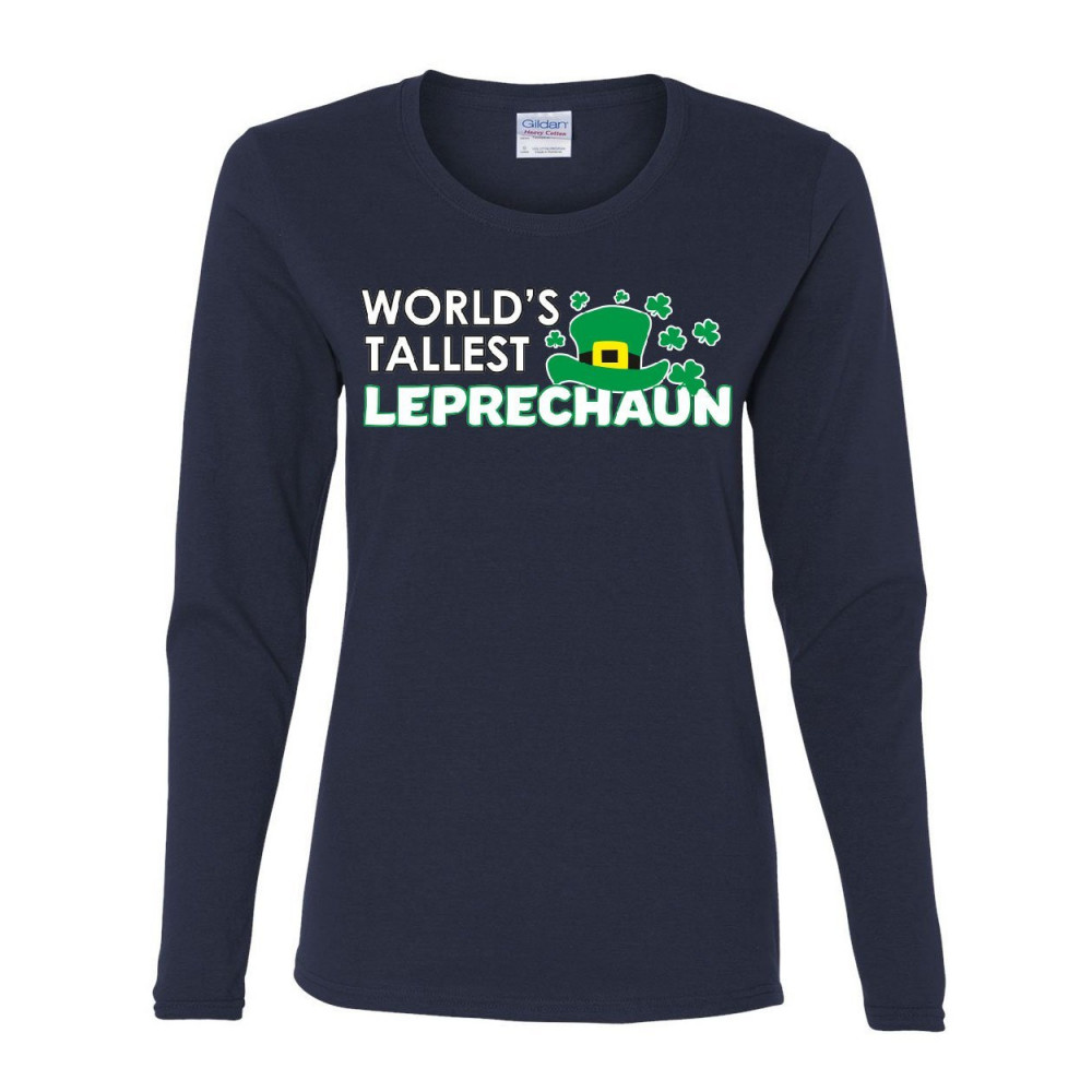 WORLDS TALLEST LEPRECHAUN women's long sleeve tee st patrick's day shamrock beer navy blue