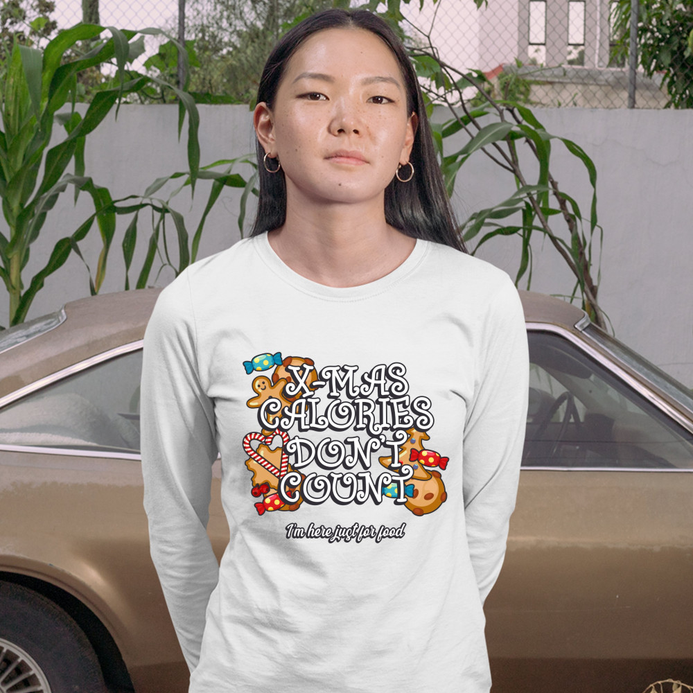 X-MAS CALORIES DON'T COUNT women's long sleeve t-shirt merry christmas funny white