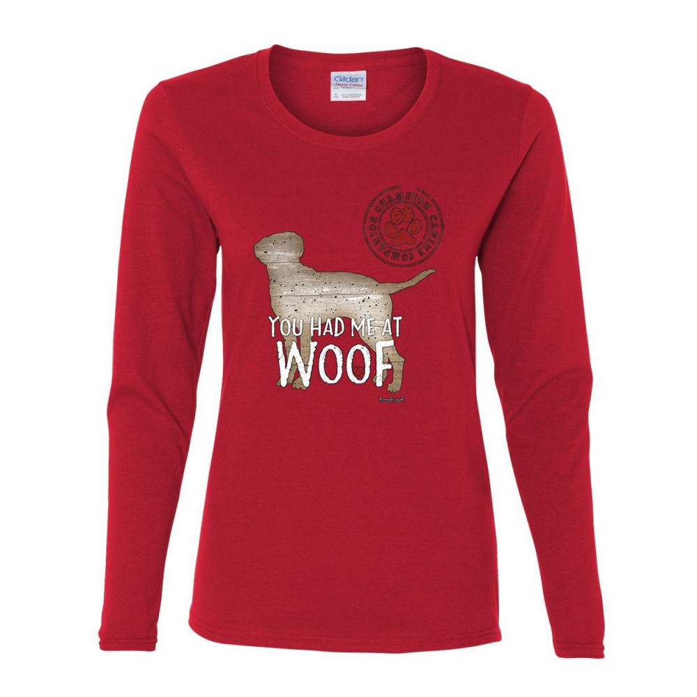 YOU HAD ME AT WOOF women's long sleeve tee pet friend dogs doggie puppy paw bark red