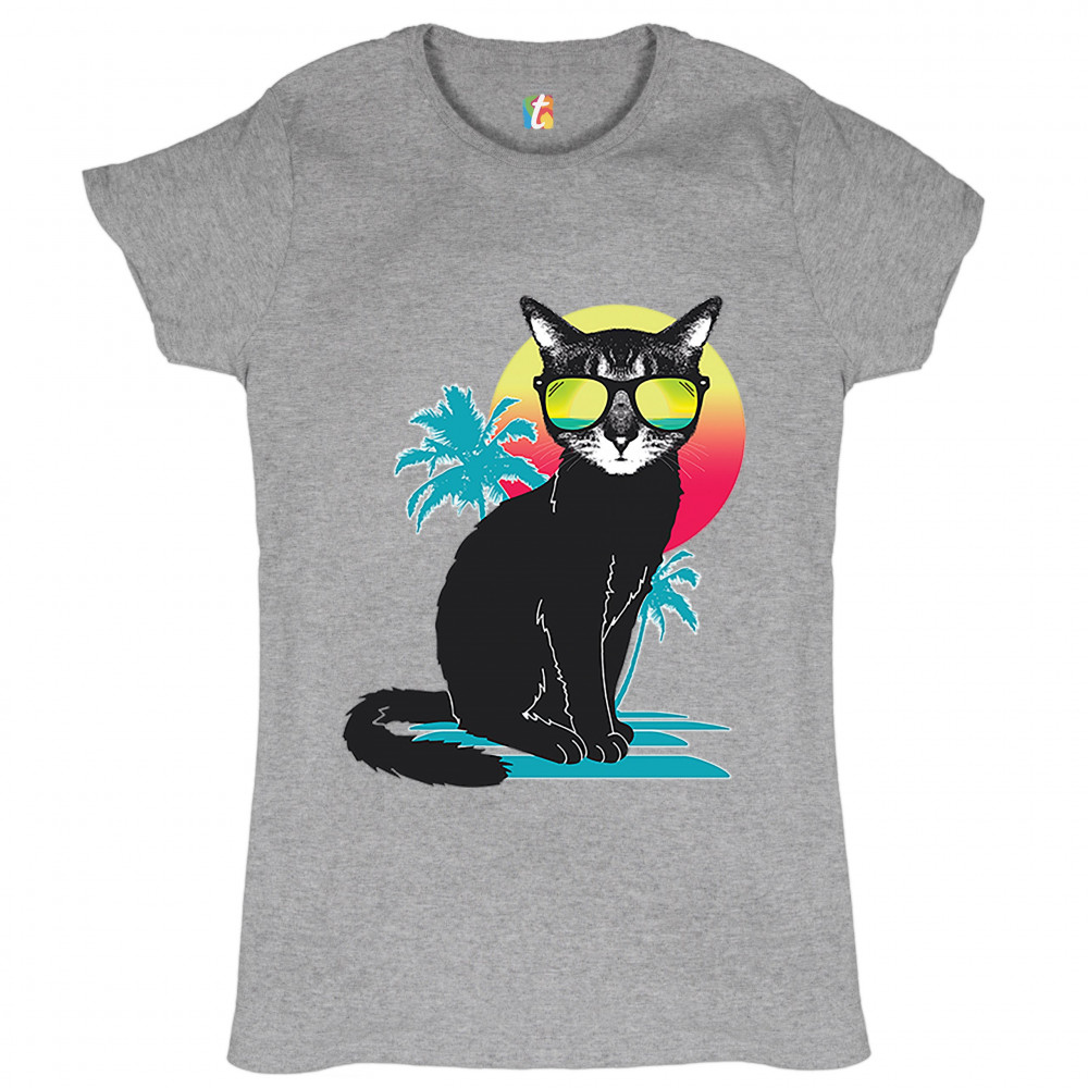 COOL SUMMER CAT t-shirt neon kitty on a beach animal lovers women's tee gray