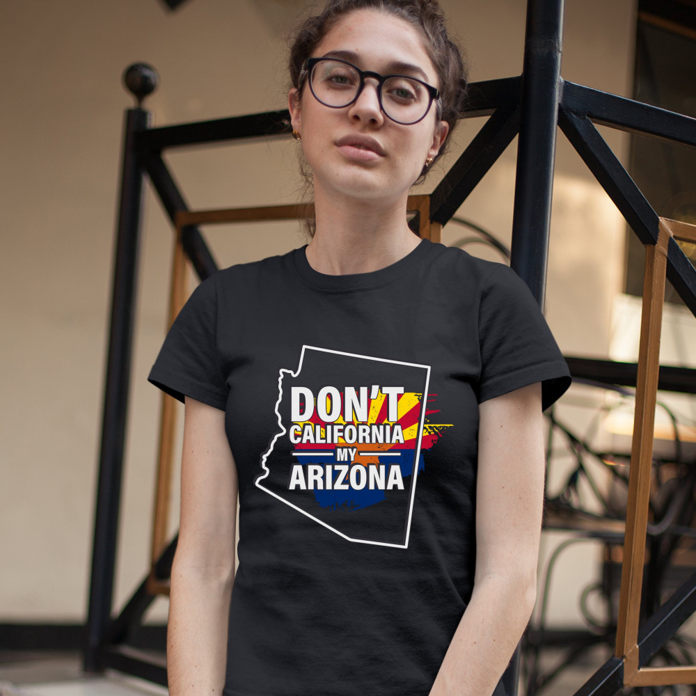 A political print featuring a silhouette of the state of Arizona and it's flag on the inside. The print says: "Don't California my Arizona". A great choice for anyone who is concerned for a huge number of Californians moving to their
