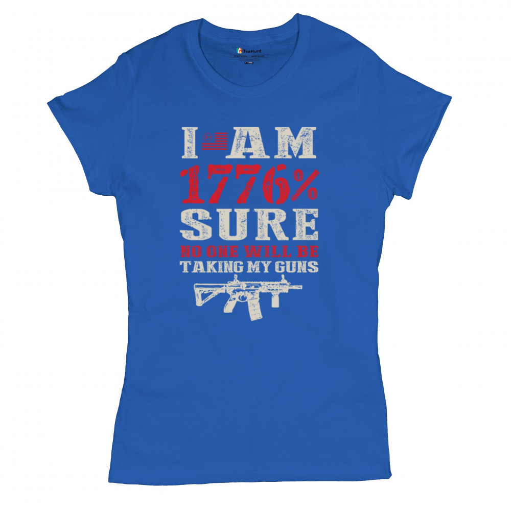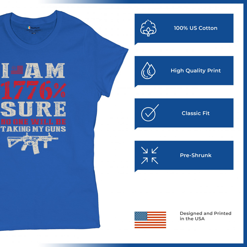 This eye-catching design shouts American pride with its 1776% certainty and pro-gun message. A distressed rifle graphic pairs with bold lettering and patriotic red, white, and blue styling. Perfect for gun owners, liberty advocates, and veterans who take their constitutional rights seriously. A true celebration of freedom and firepower.