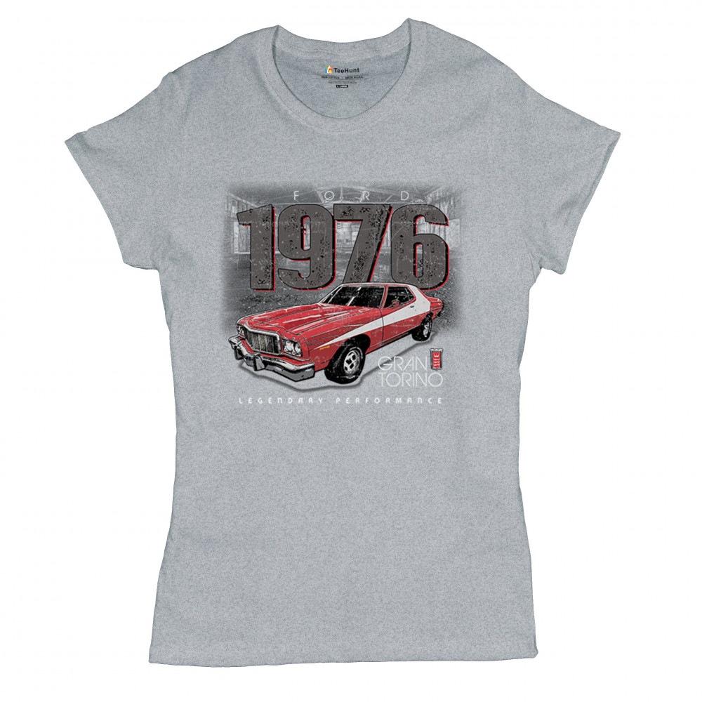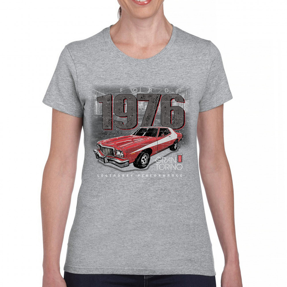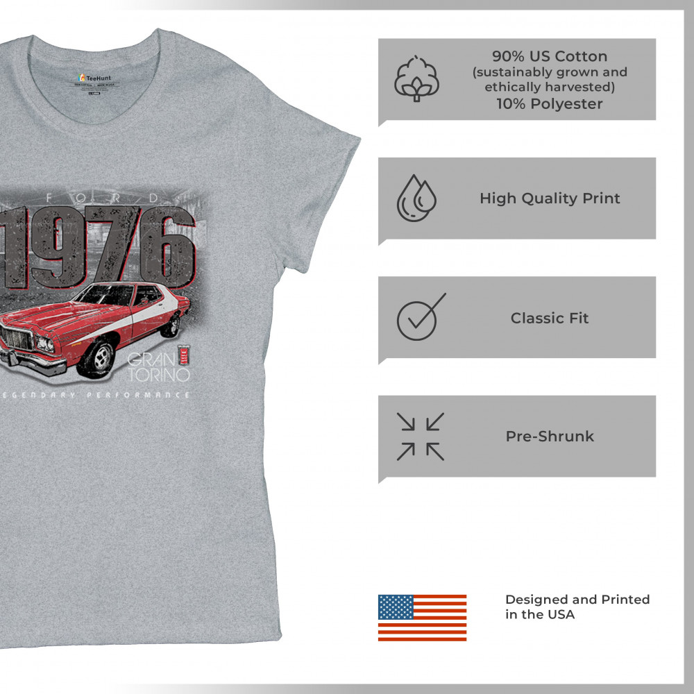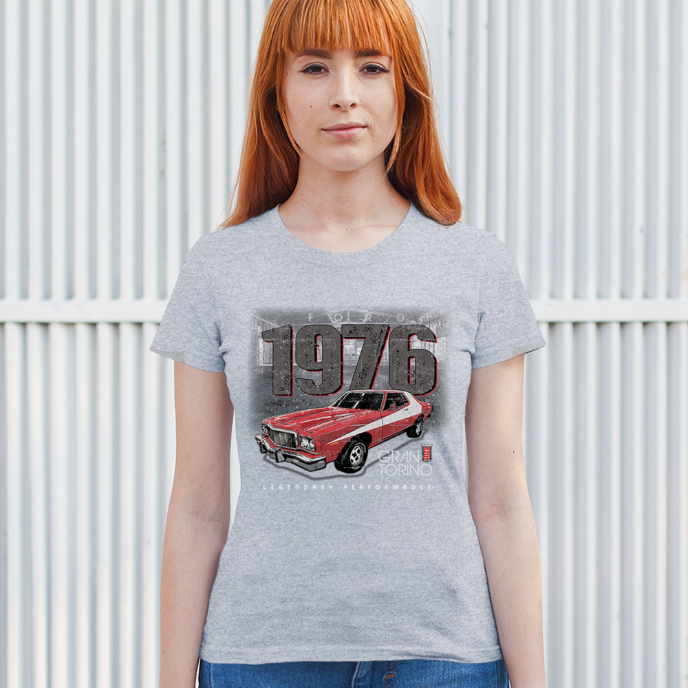 1976 Ford Gran Torino design with red and white retro style. Perfect for muscle car fans, Ford lovers, and classic car event gear.