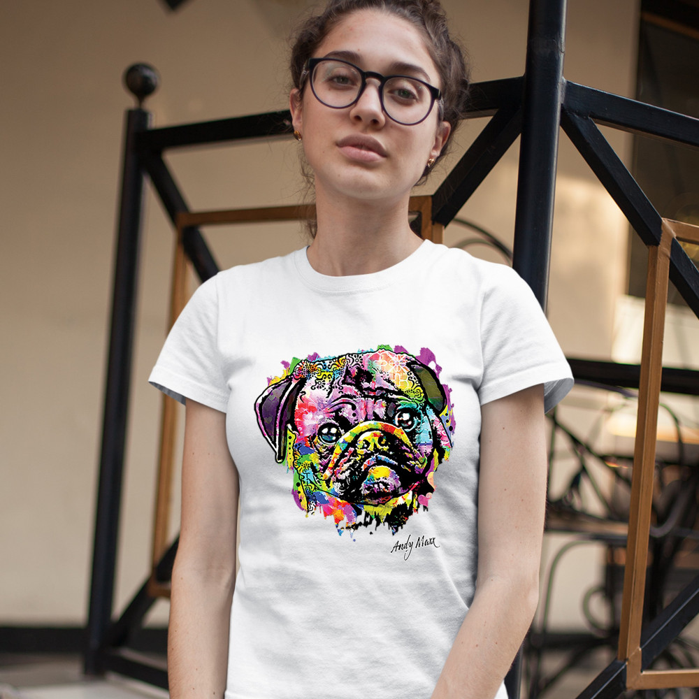 A beautiful print featuring a colorful face of an adorable pug. Below the dog the name of the artist - Andy Maxx - is included. A great choice for a person who is in love with these adorable and gentle dogs.