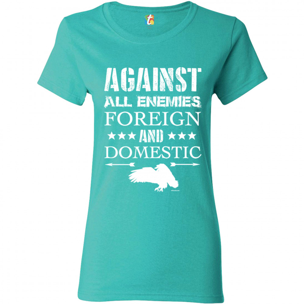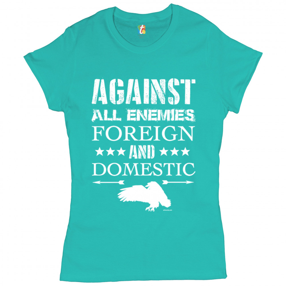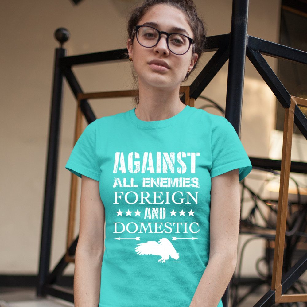 A patriotic print saying "Against All Enemies Foreign and Domestic" and featuring a silhouette of an eagle. Great choice to wear on Independence Day or any other patriotic holiday.