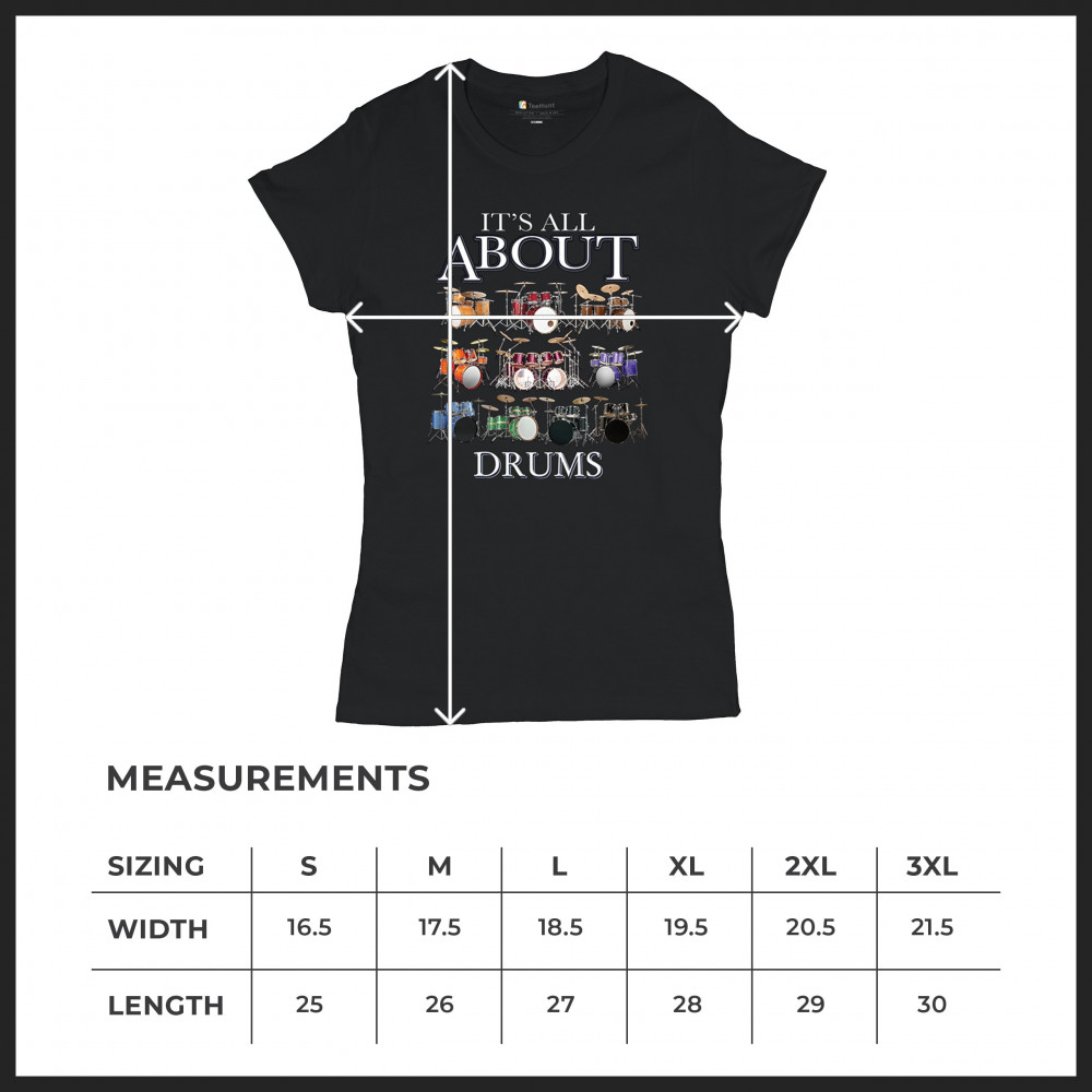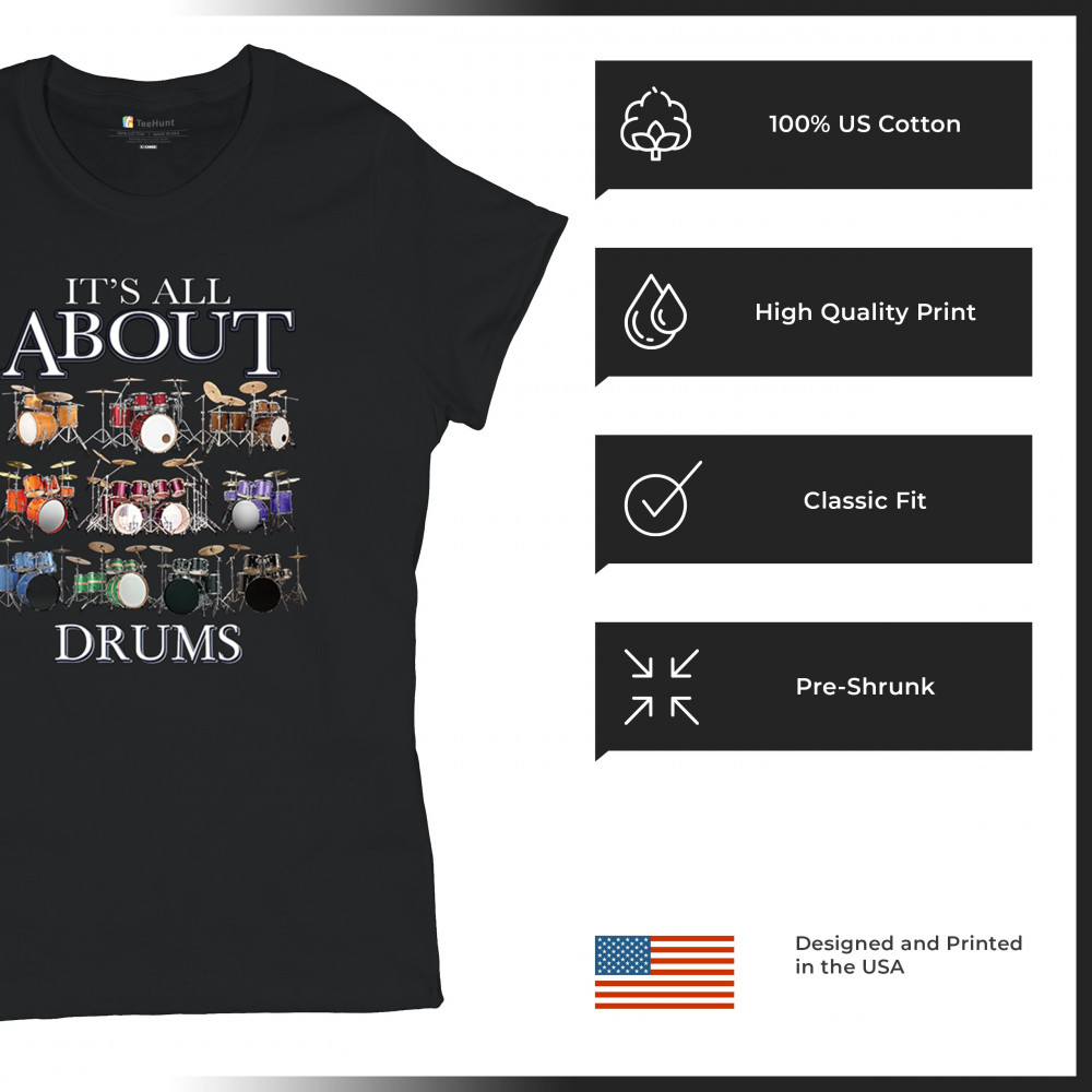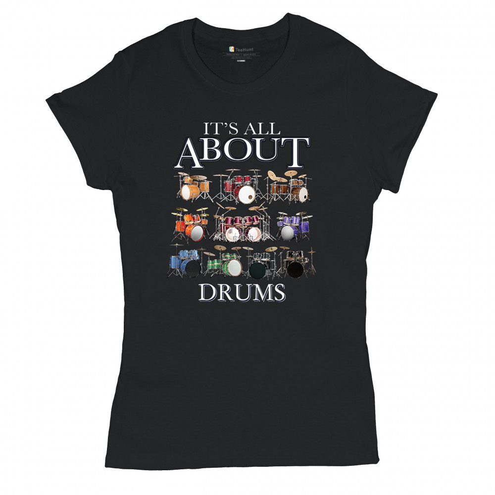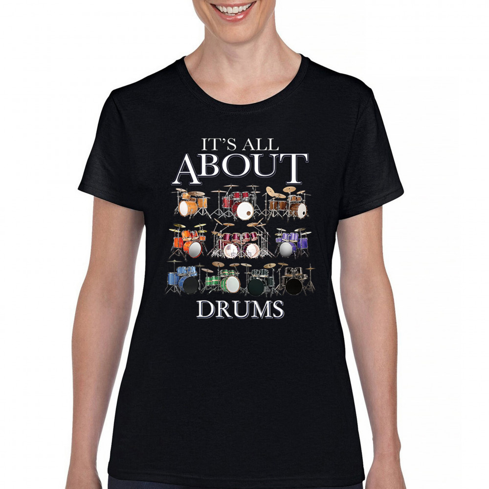 ALL ABOUT DRUMS t-shirt colorful funny drummer music festival party women's tee black