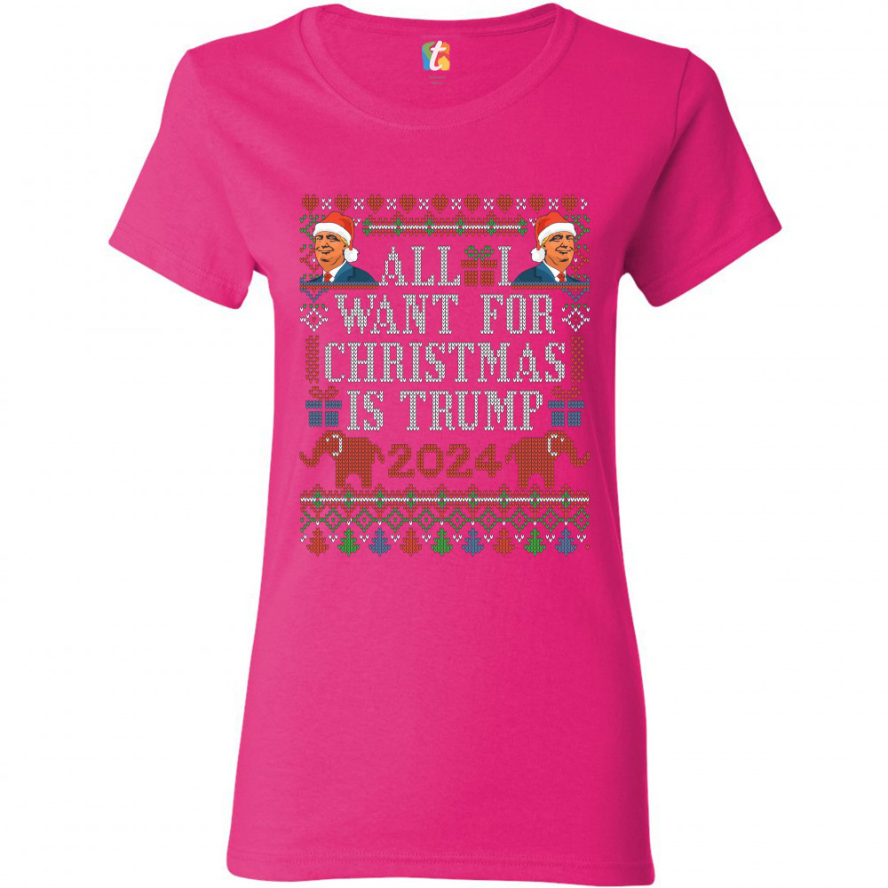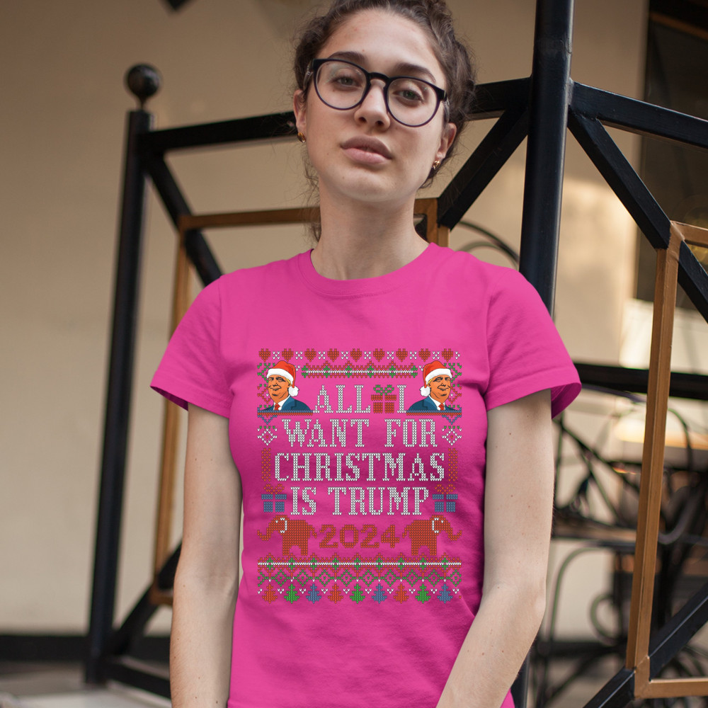 A funny print saying: "All I Want for Christmas Is Trump 2024". The print is decorated as a Christmas ugly sweater and features faces of Donald Trump wearing Christmas hats and two elephants. A great choice to wear for a Christmas or New Year's Eve party