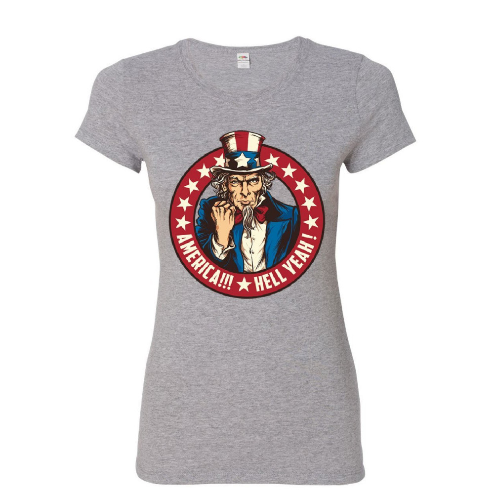 AMERICA HELL YEAH women's t-shirt uncle sam patriotic stars and stripes shirt gray