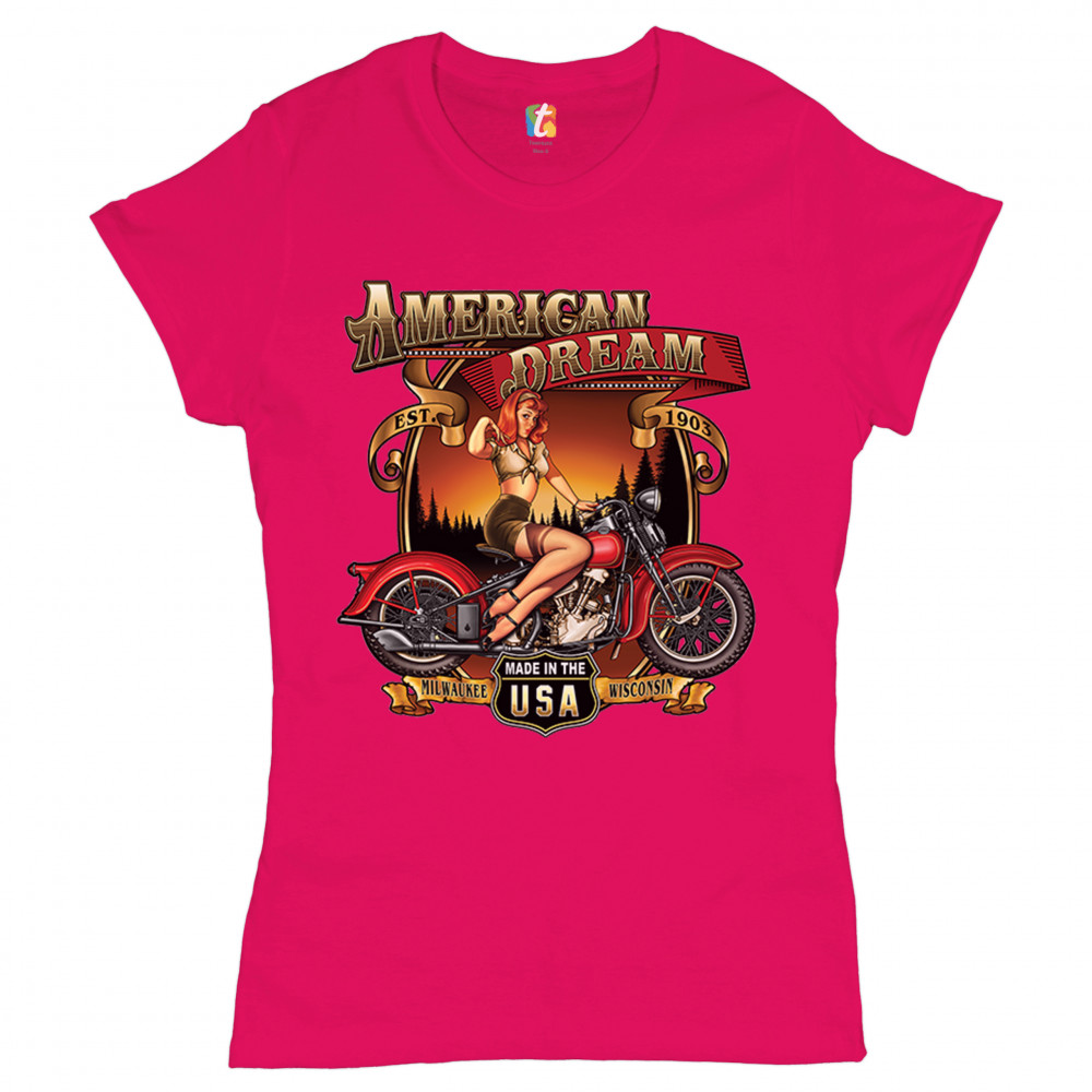 A print featuring a sexy pin up girl sitting on a vintage motorcycle. The print says: "American Dream est. 1903". In the bottom there is a sign saying: "made in the USA". To the left and right of it "Milwaukee Wisconsin" is written on a stripe. Great choice for any motorcycle enthusiast.