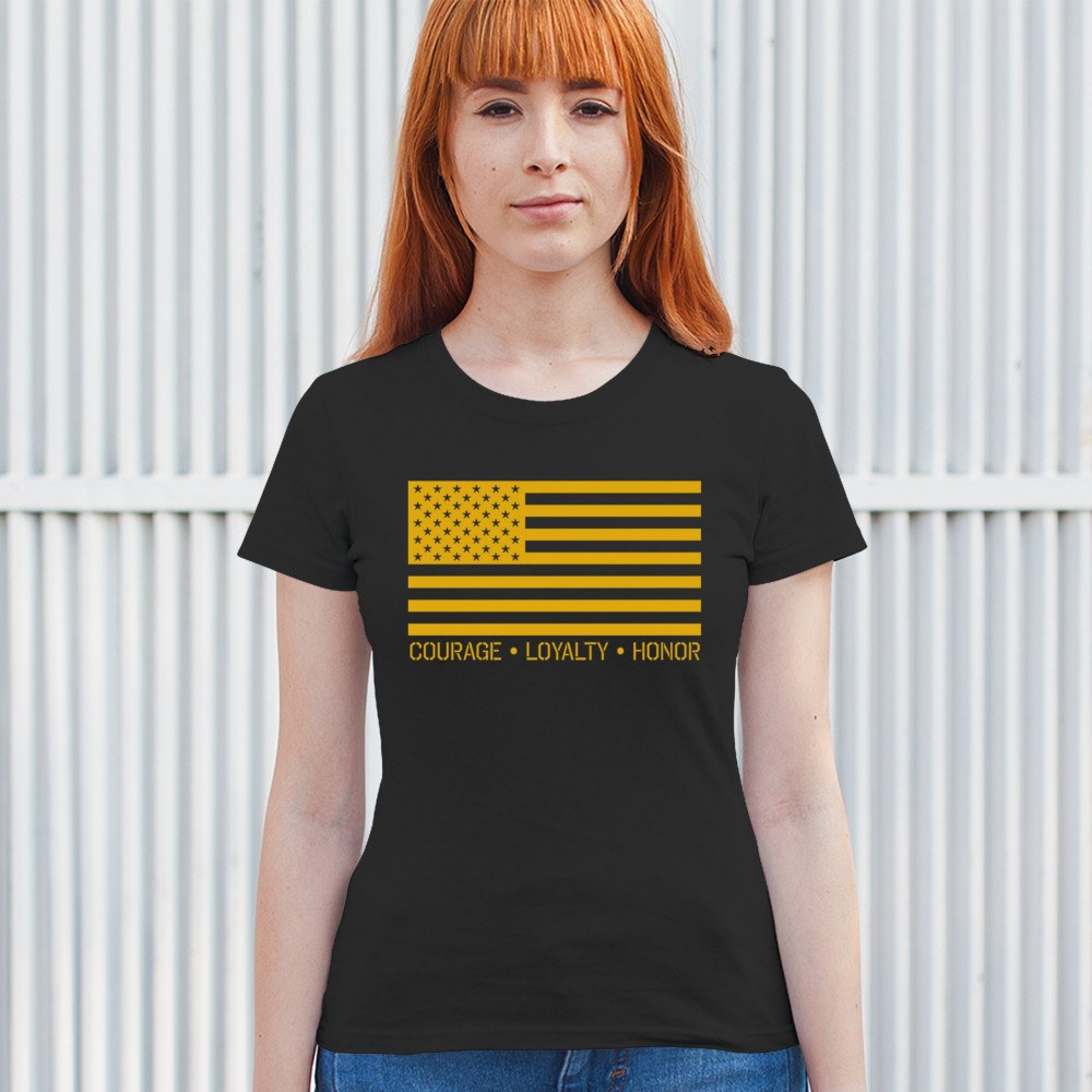 Honor the brave with our "Courage, Loyalty, Honor" USA flag shirt. Perfect for veterans and patriots. Ideal for Memorial Day and Veterans Day.