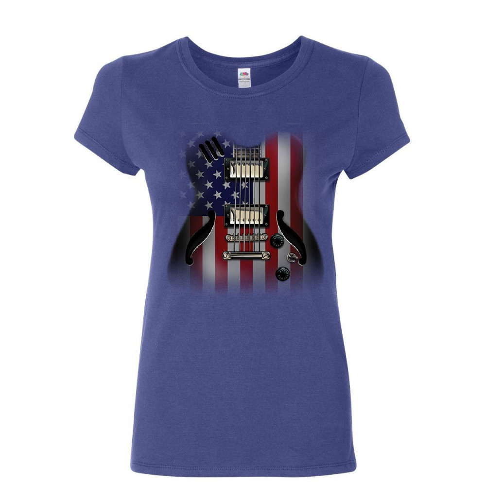 AMERICAN FLAG GUITAR women's t-shirt rock and roll music art 4th of july shirt blue
