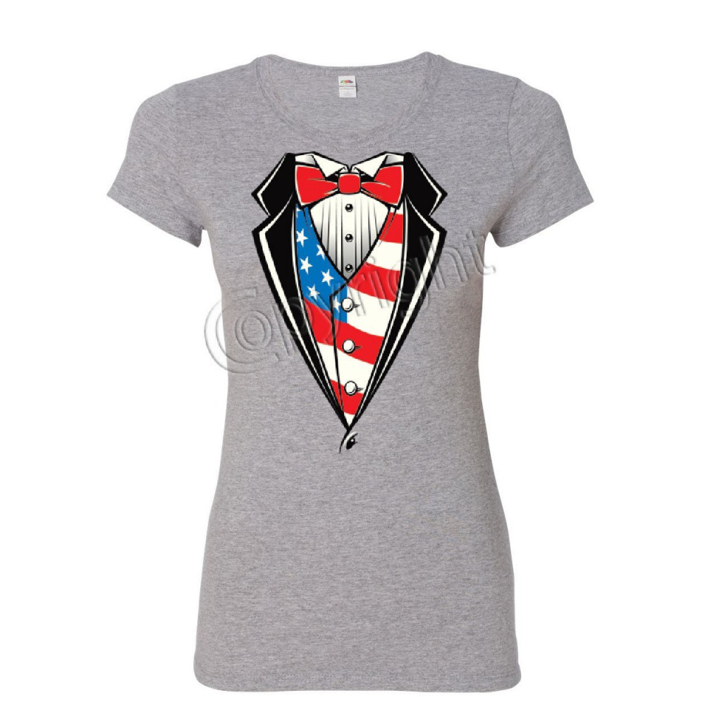 AMERICAN FLAG TUXEDO women's t-shirt funny 4th of july stars and stripes shirt gray