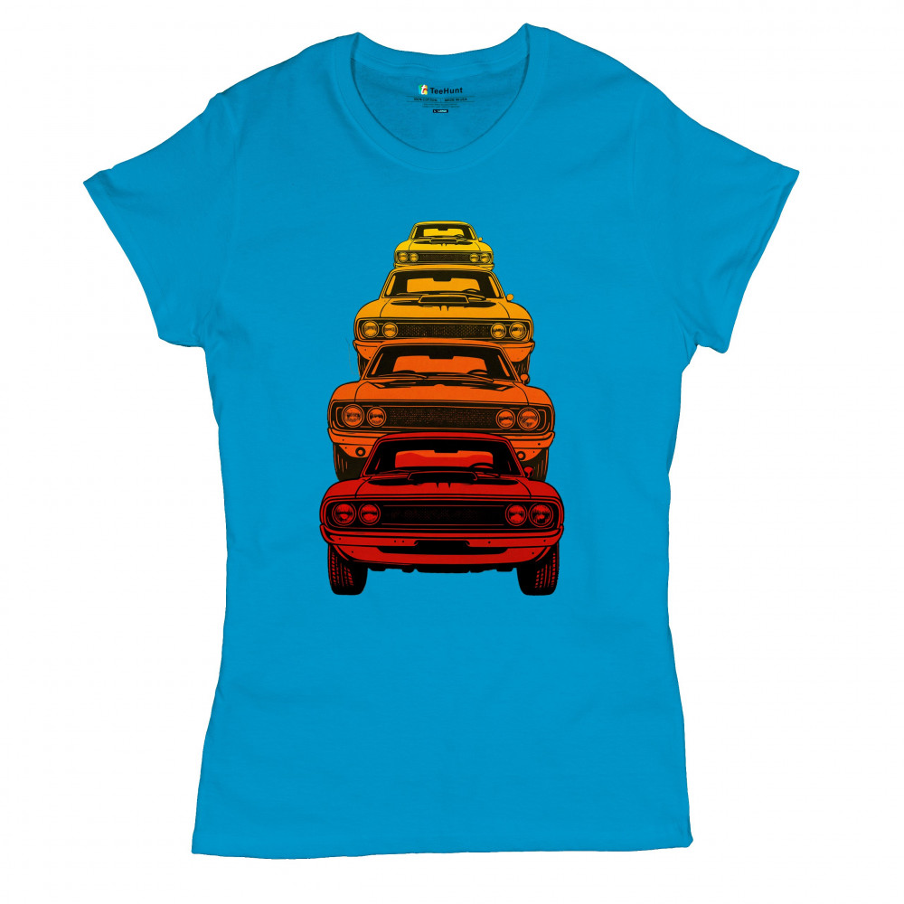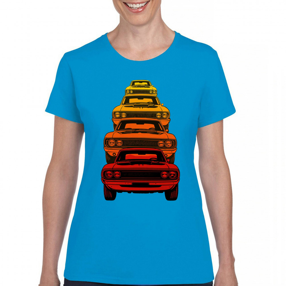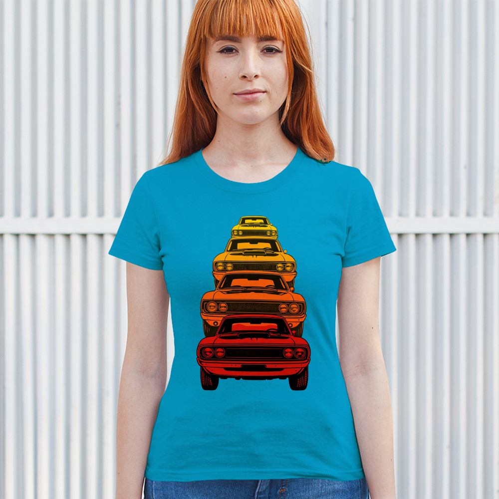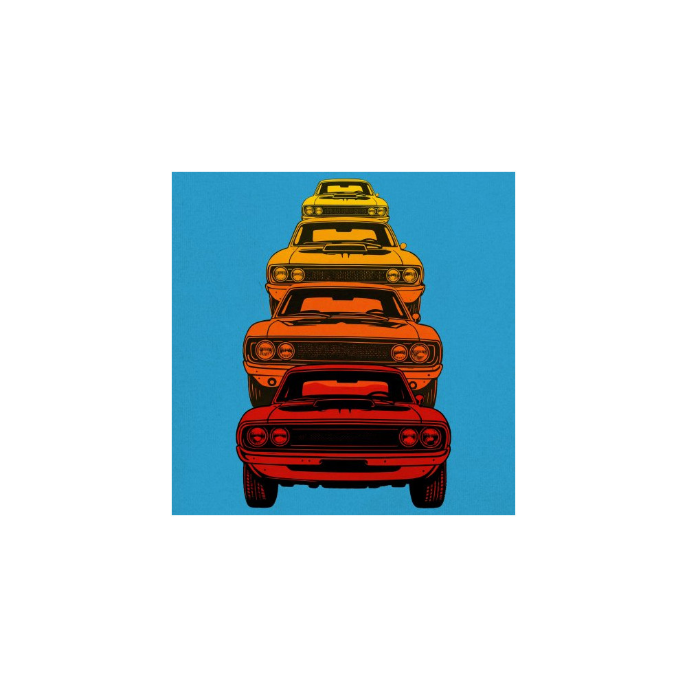 Celebrate horsepower heritage with this colorful lineup of classic muscle cars. Featuring a stacked gradient from red to yellow, this design brings bold retro attitude, V8 pride, and American torque to life. Perfect for collectors, gearheads, and fans of classic car power.