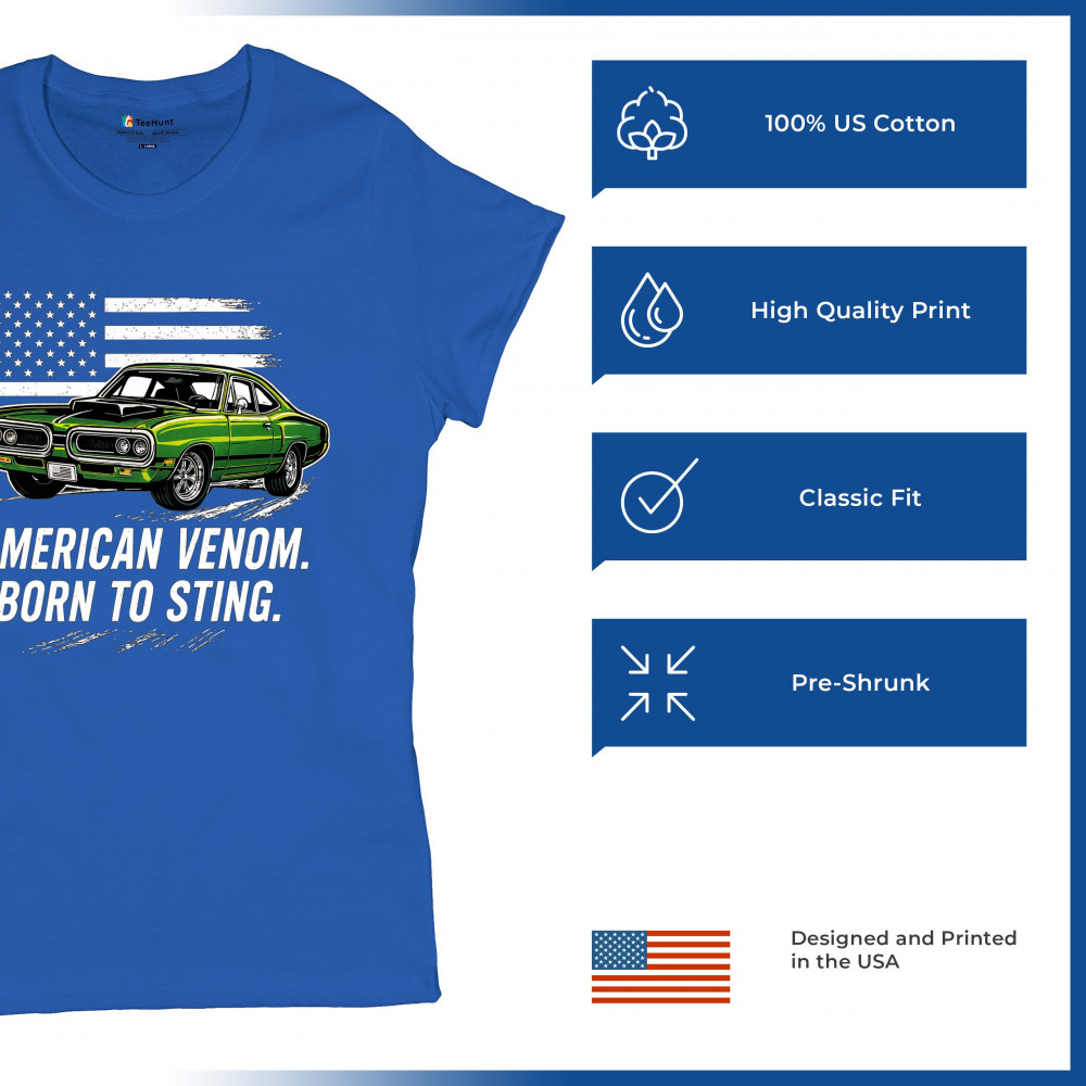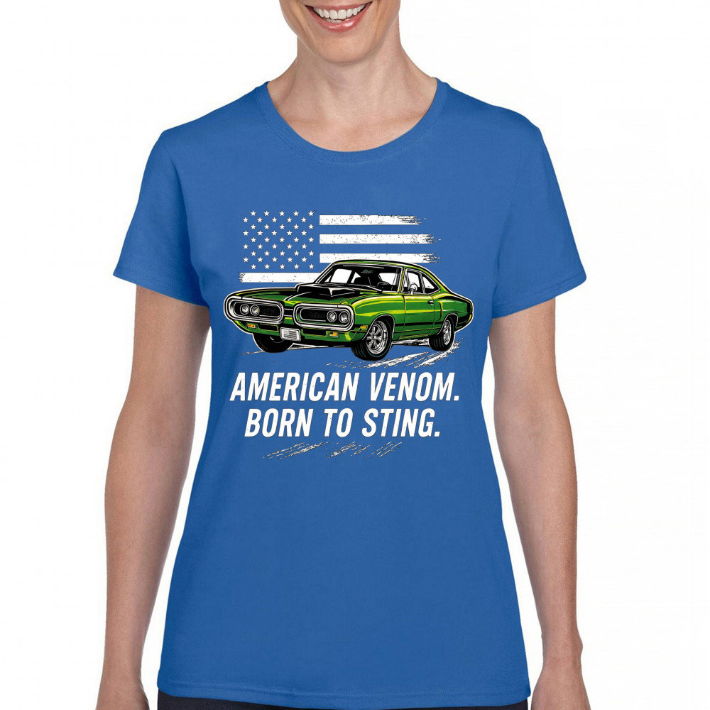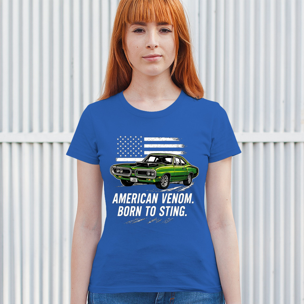 Inject venom into your street style with this bold green muscle car design. With “Born to Sting†power and a backdrop of American pride, this graphic is perfect for Scat fans, gearheads, and drivers who embrace speed, dominance, and the sound of true muscle. Rule car meets, rev battles, and highway runs with unmatched attitude.