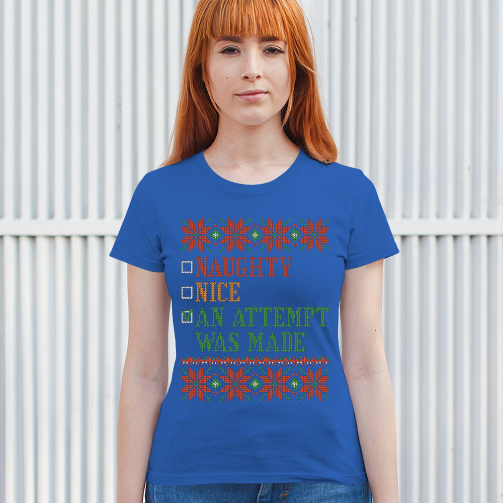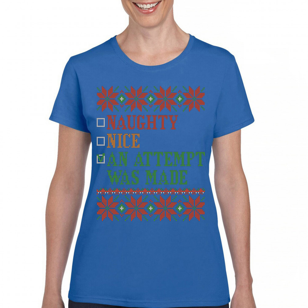 AN ATTEMPT WAS MADE t-shirt ugly sweater naughty or nice christmas women's tee royal blue