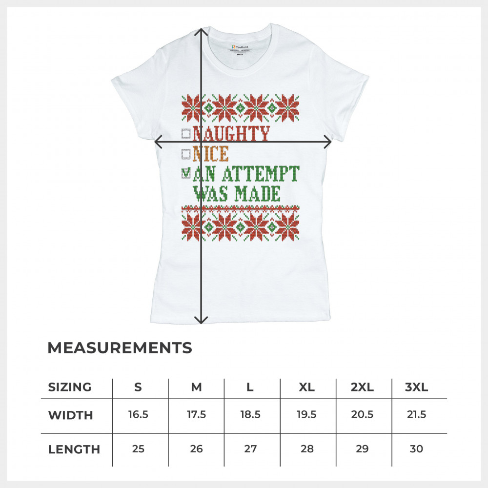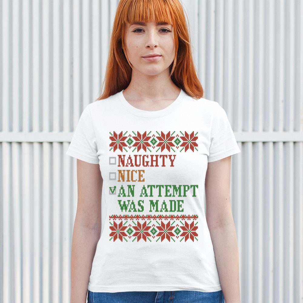 A funny print featuring a check list with options: "Naughty", "Nice" and a checked one "An Attempt Was Made". The print is decorated as an ugly sweater. Amazing choice to make people smile and spread positive vibes on Christmas Eve.