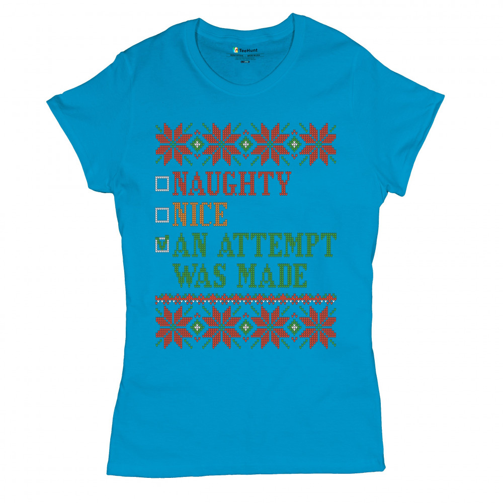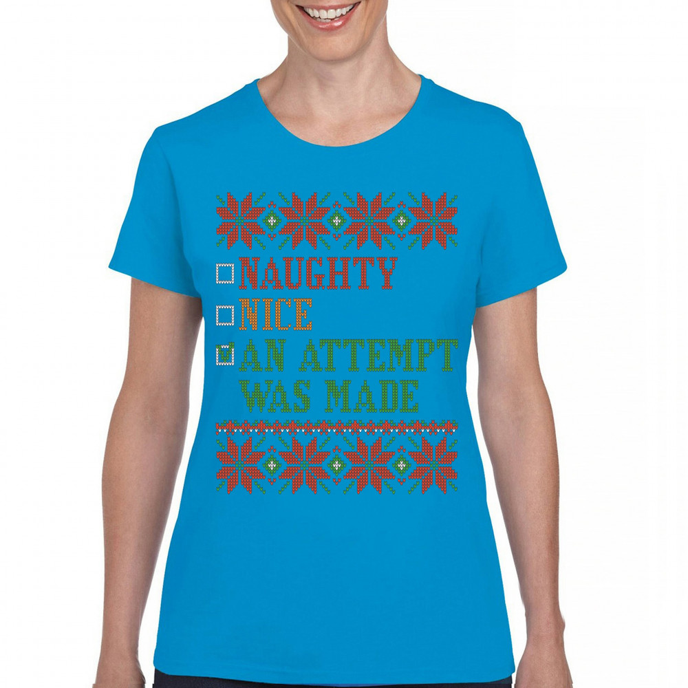 AN ATTEMPT WAS MADE t-shirt ugly sweater naughty or nice christmas women's tee light blue