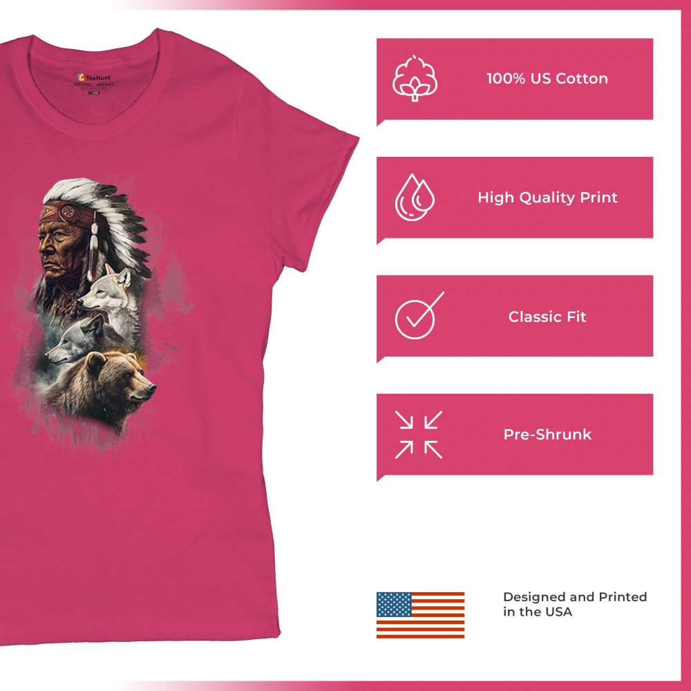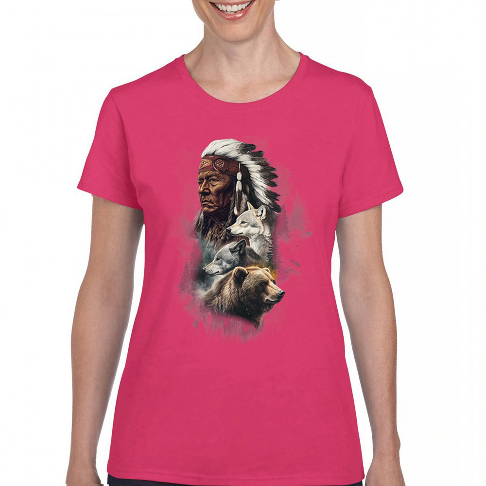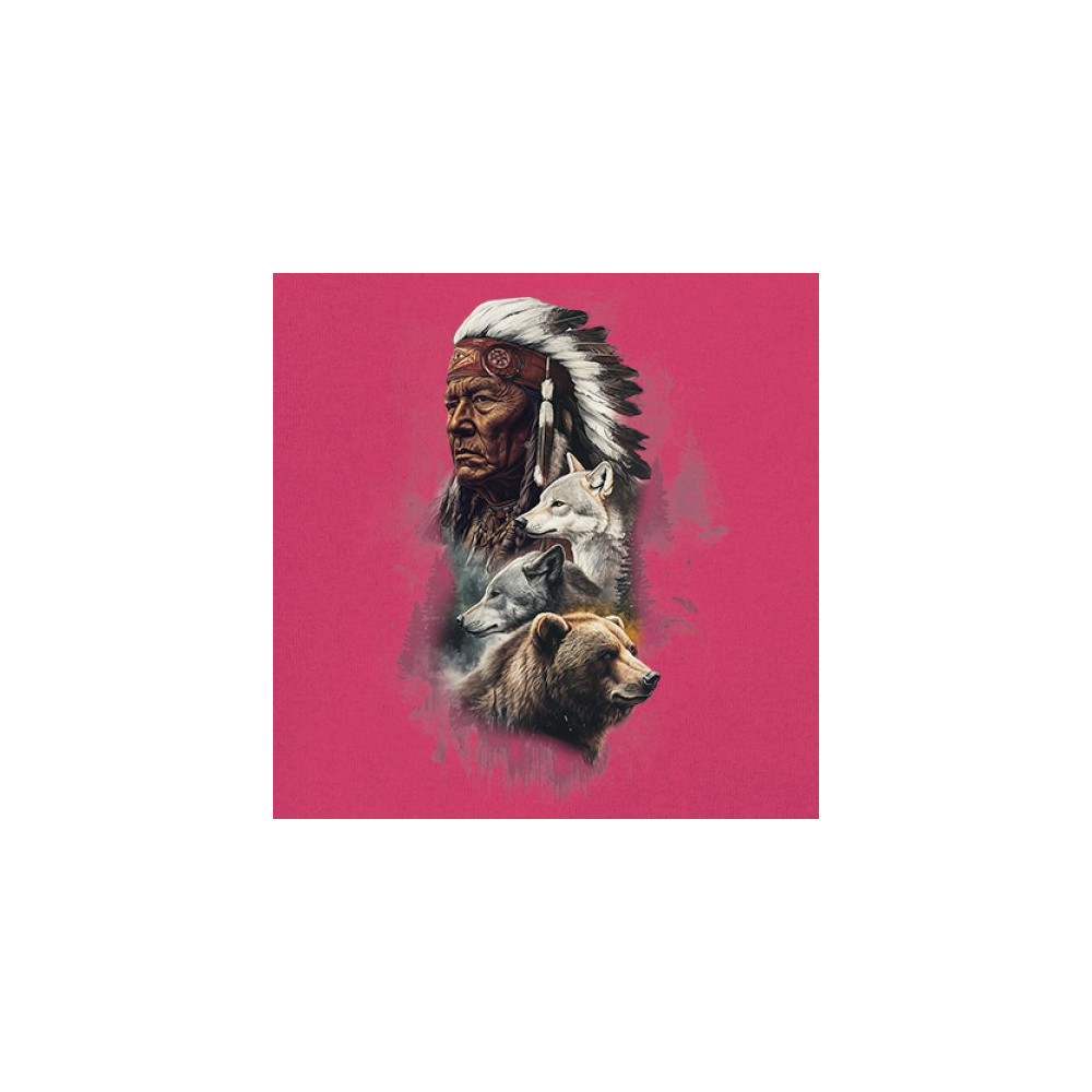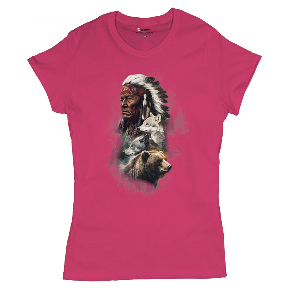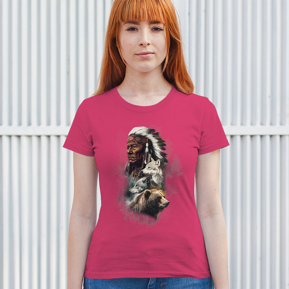 Celebrate spiritual strength and heritage with this design featuring a Native American elder alongside wolves and a bear. This tribal and totemic art reflects wisdom, guardianship, and deep forest spirit energy. Perfect for cultural pride, animal lovers, and those connected to spiritual symbolism in nature.