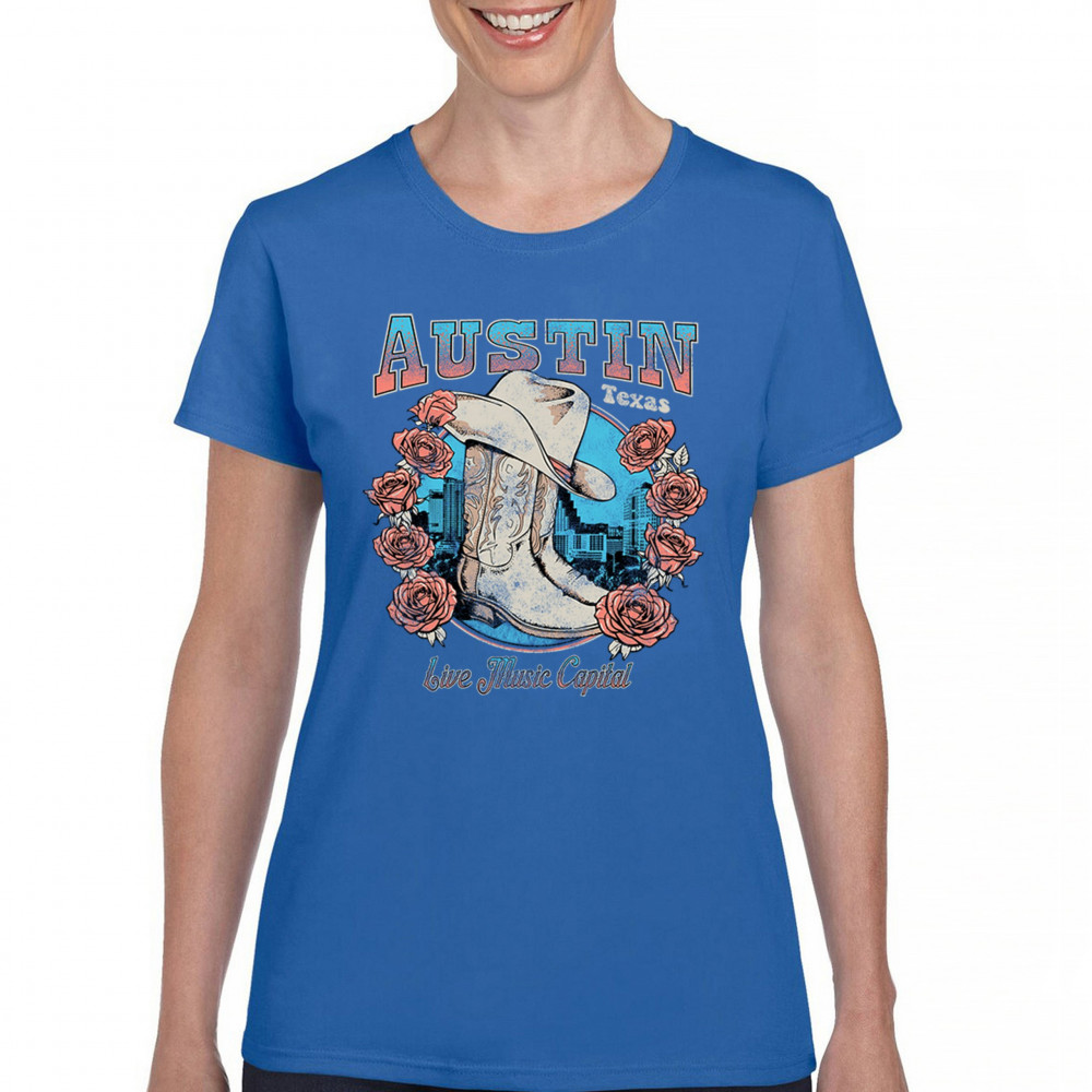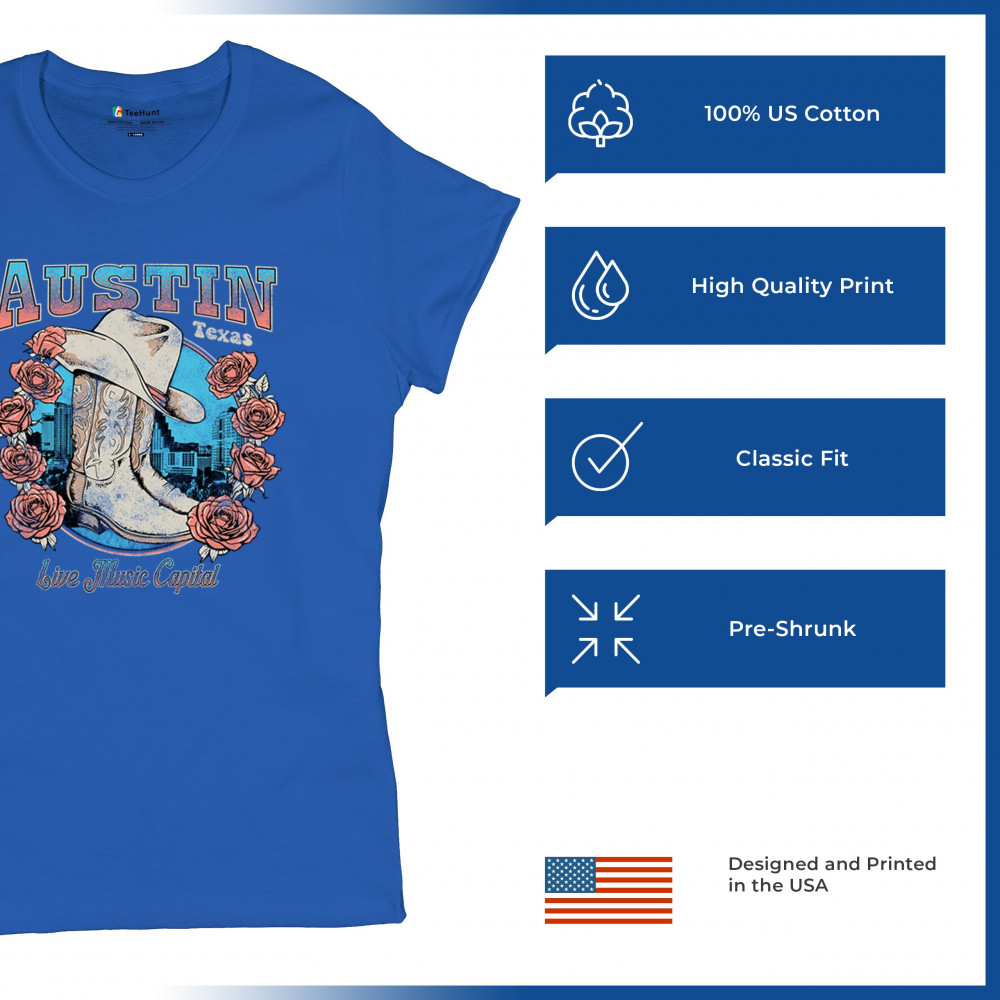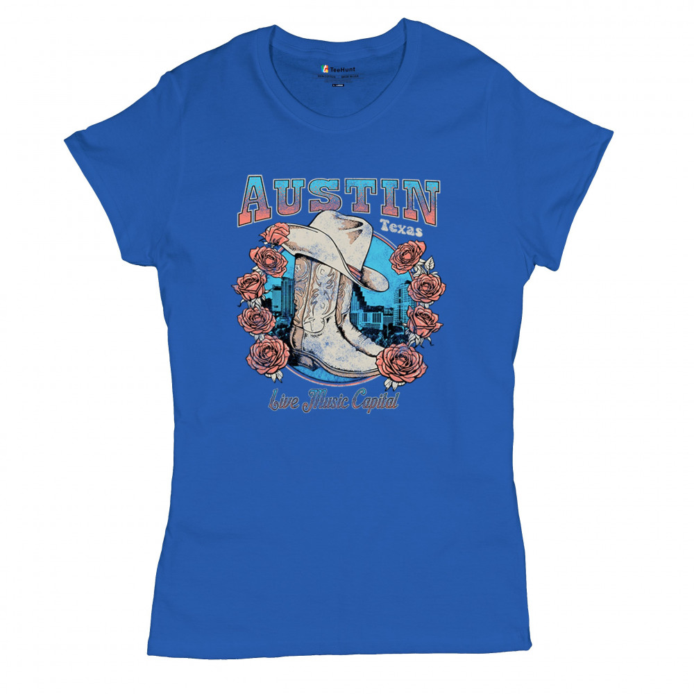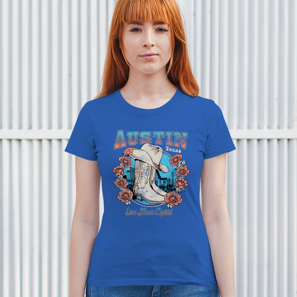 Austin TX Live Music Capital comes alive in this vintage cowgirl boots and hat design, accented by roses and the city skyline. Perfect for lovers of country music, honkytonk vibes, and western chic, this design embodies southern spirit, rustic grit, and the proud Americana aesthetic of Texas’ iconic music scene.
