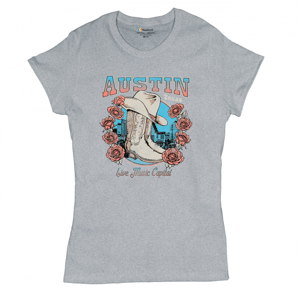 Austin TX Live Music Capital comes alive in this vintage cowgirl boots and hat design, accented by roses and the city skyline. Perfect for lovers of country music, honkytonk vibes, and western chic, this design embodies southern spirit, rustic grit, and the proud Americana aesthetic of Texas’ iconic music scene.