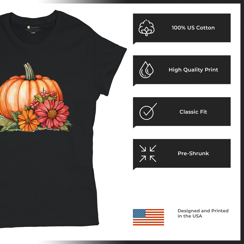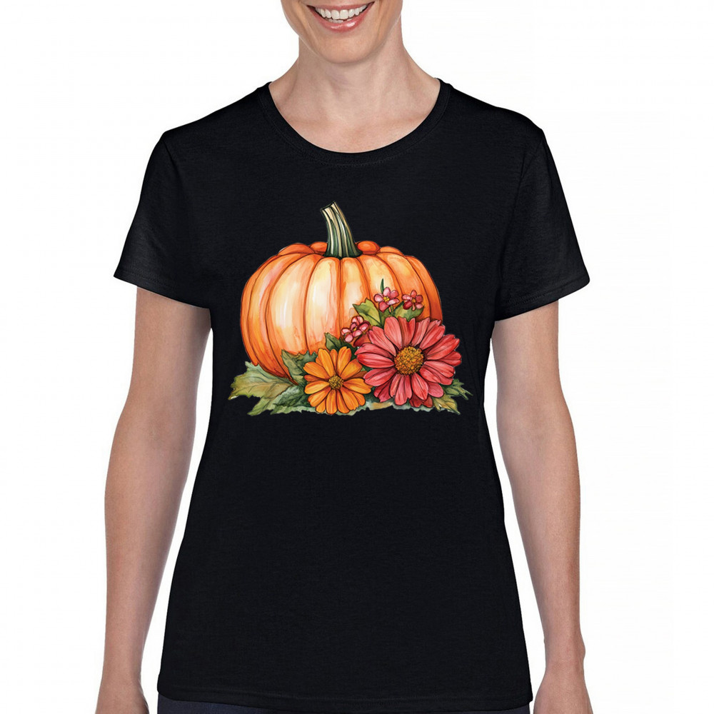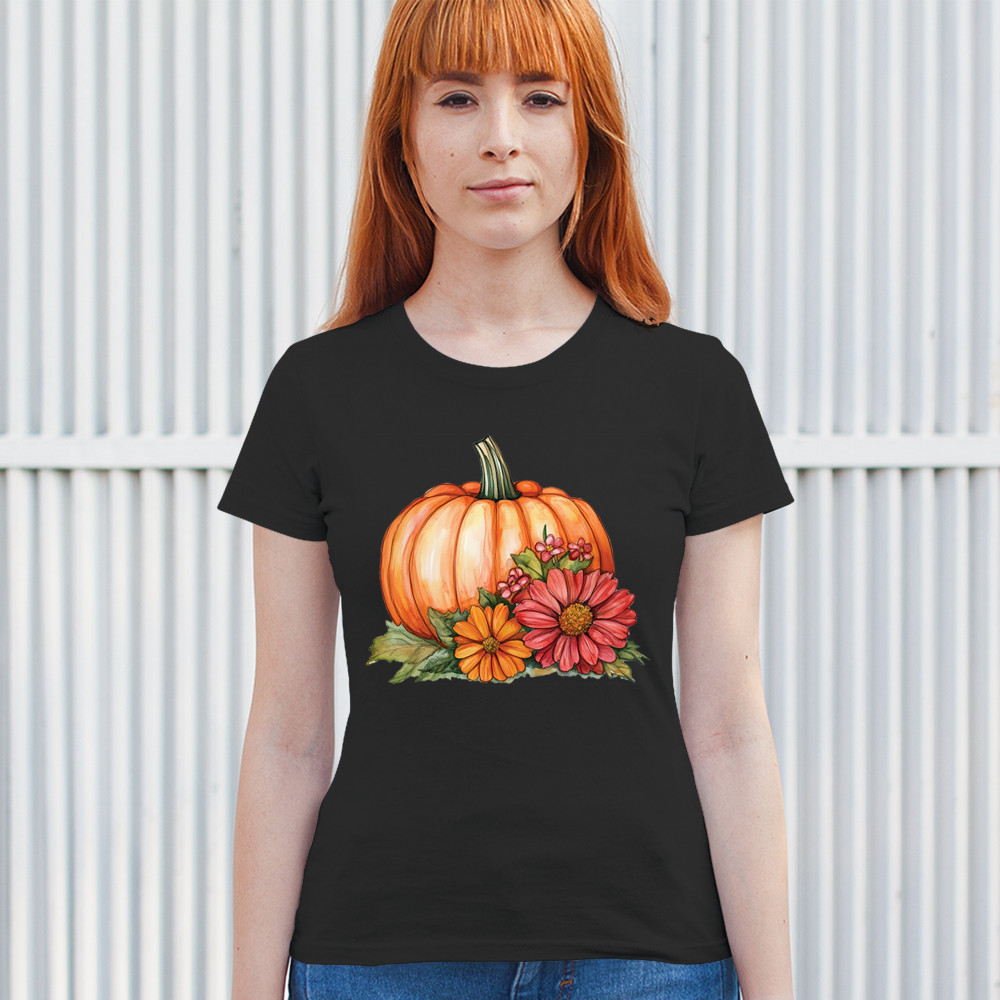AUTUMN PUMPKIN WITH FLOWERS t-shirt cute cozy fall thanksgiving women's tee black