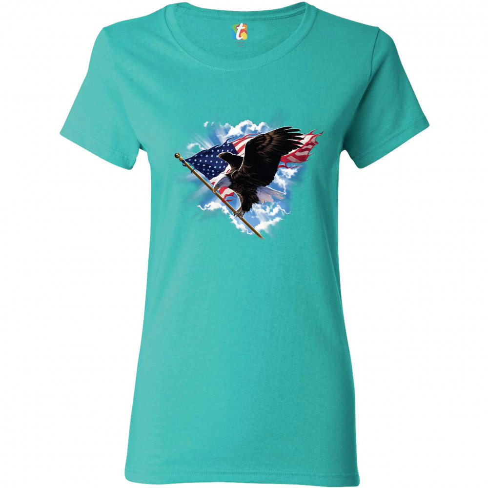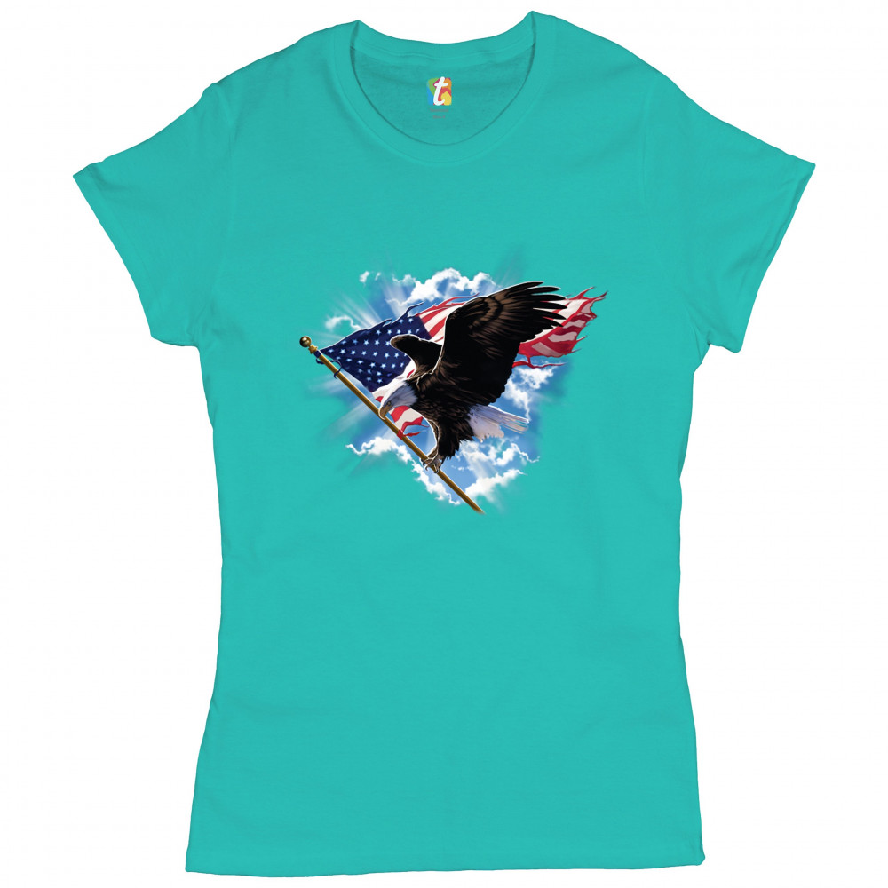 BALD EAGLE CARRYING THE AMERICAN FLAG t-shirt 4th of july patriotic women's tee light blue