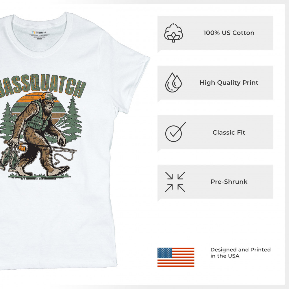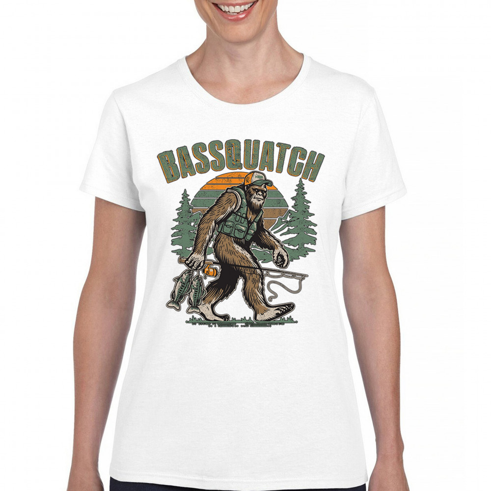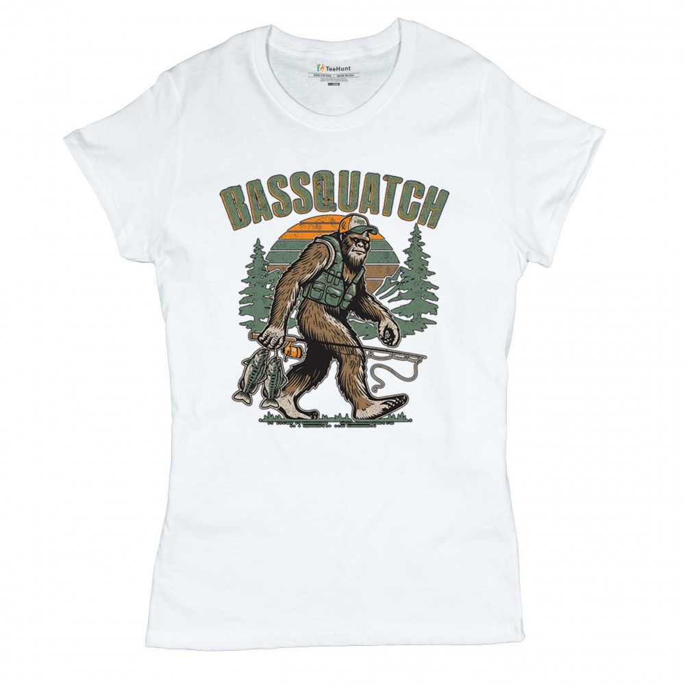 Funny Bassquatch design blends Bigfoot, fishing humor, and retro forest style. Great for anglers, cryptid lovers, and outdoorsy pun fans.