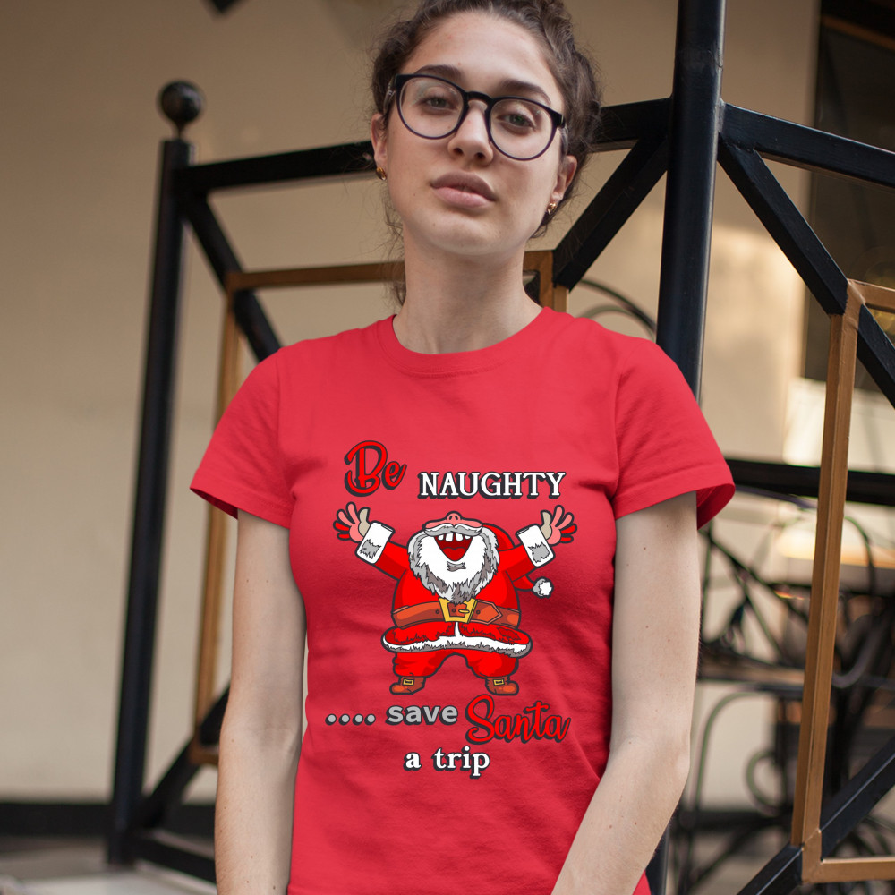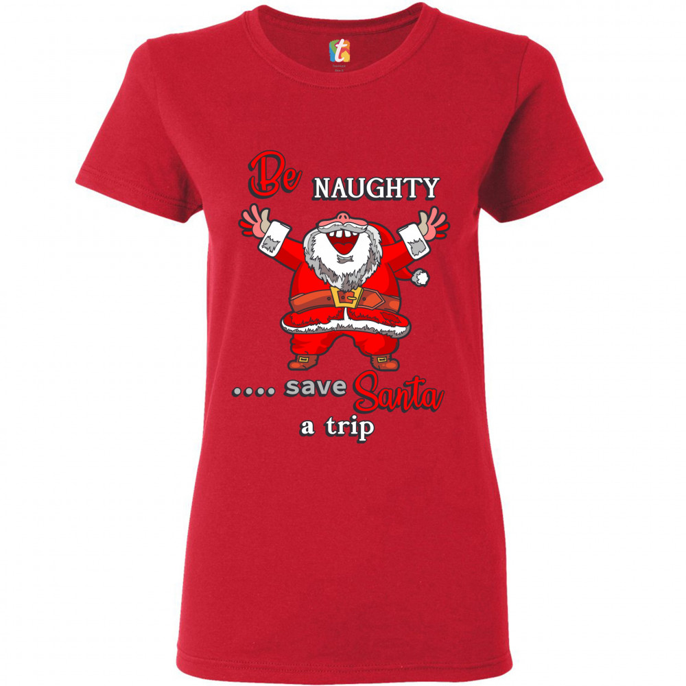 BE NAUGHTY SAVE SANTA A TRIP t-shirt holiday spirit christmas eve women's tee red