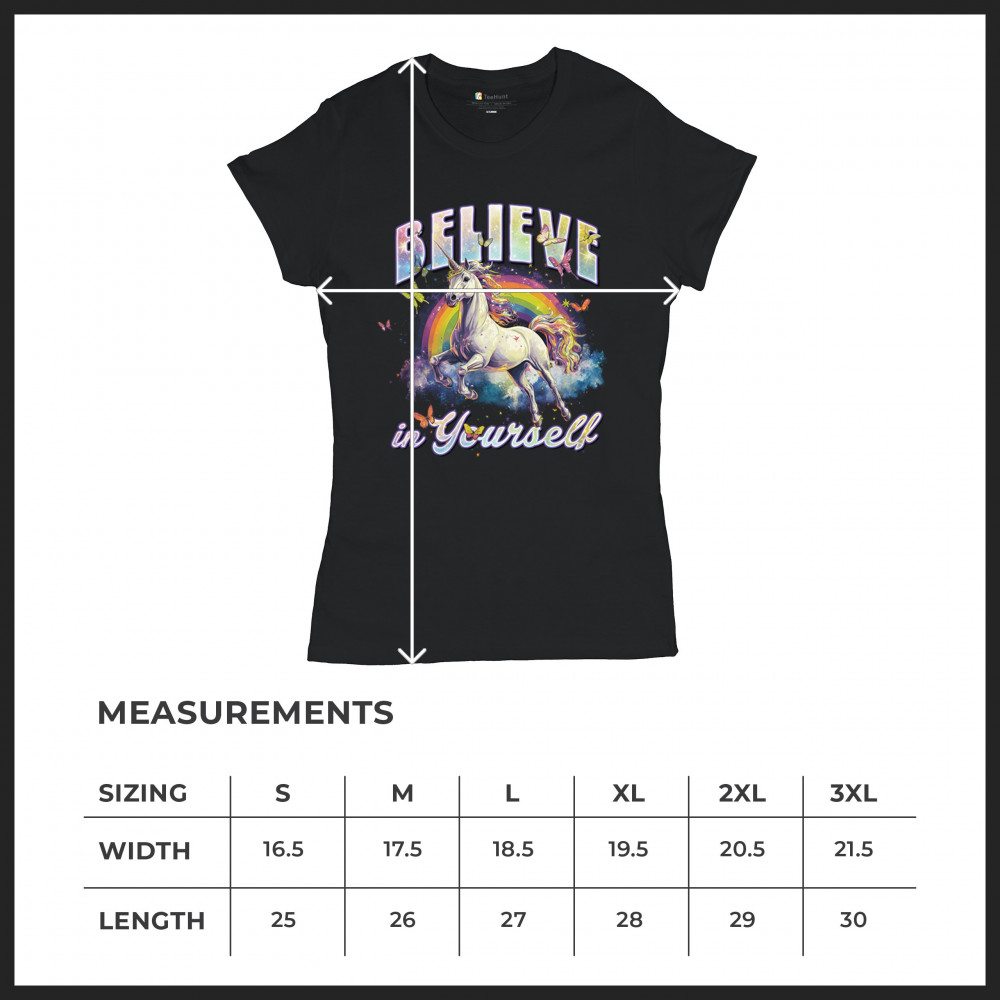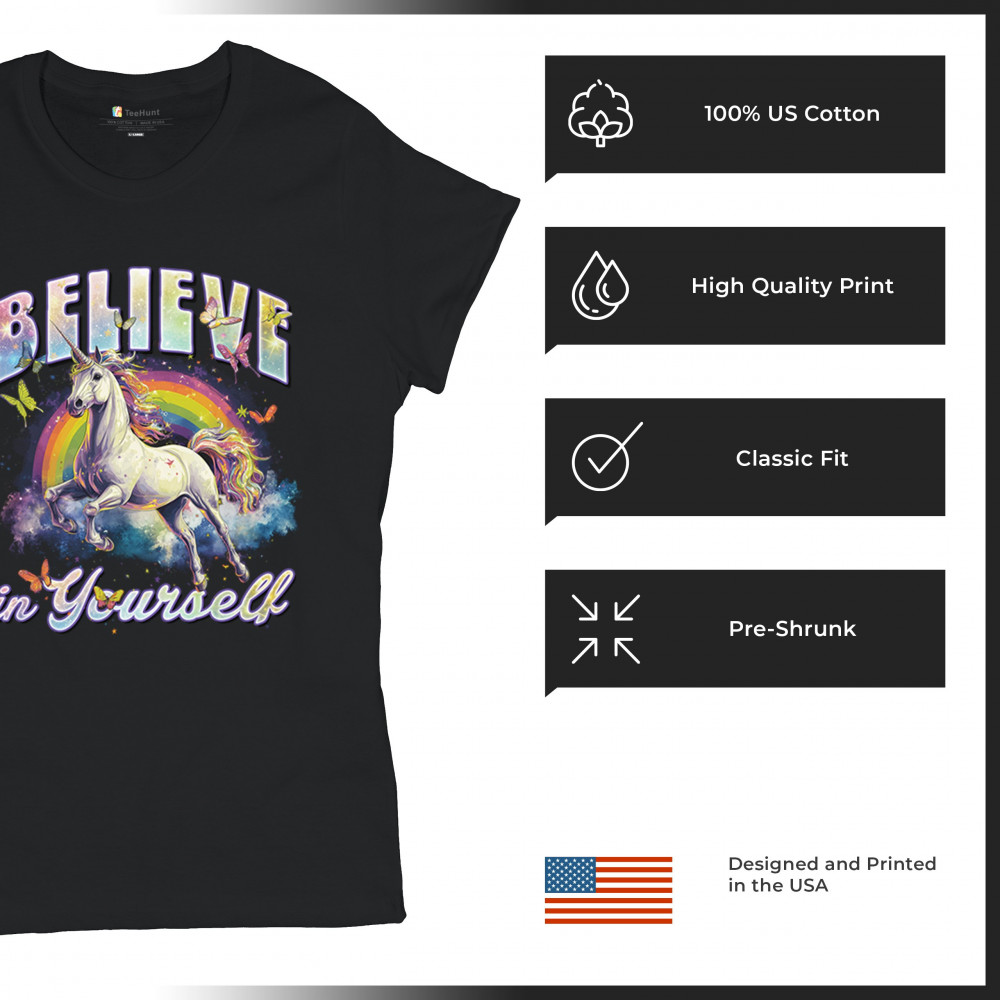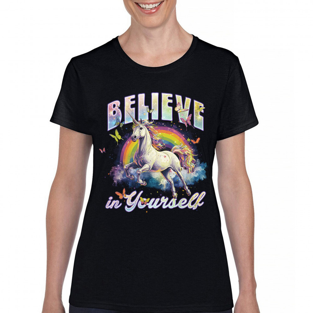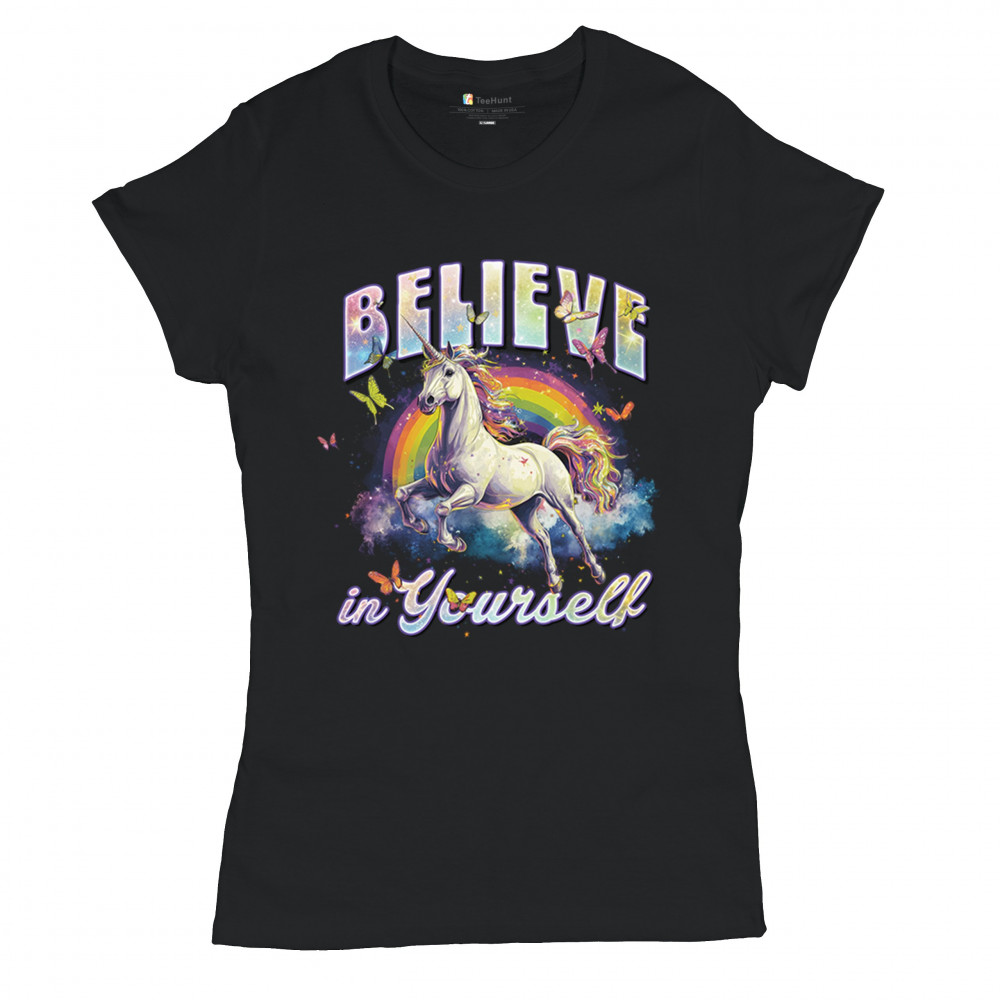 Believe in Yourself unicorn rainbow design with whimsical unicorn shirt, fantasy rainbow style, enchanted unicorn magic, galaxy sparkle, and positivity.