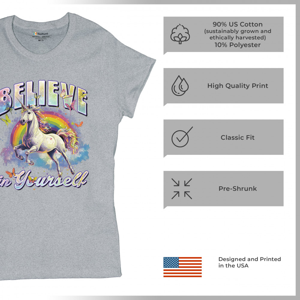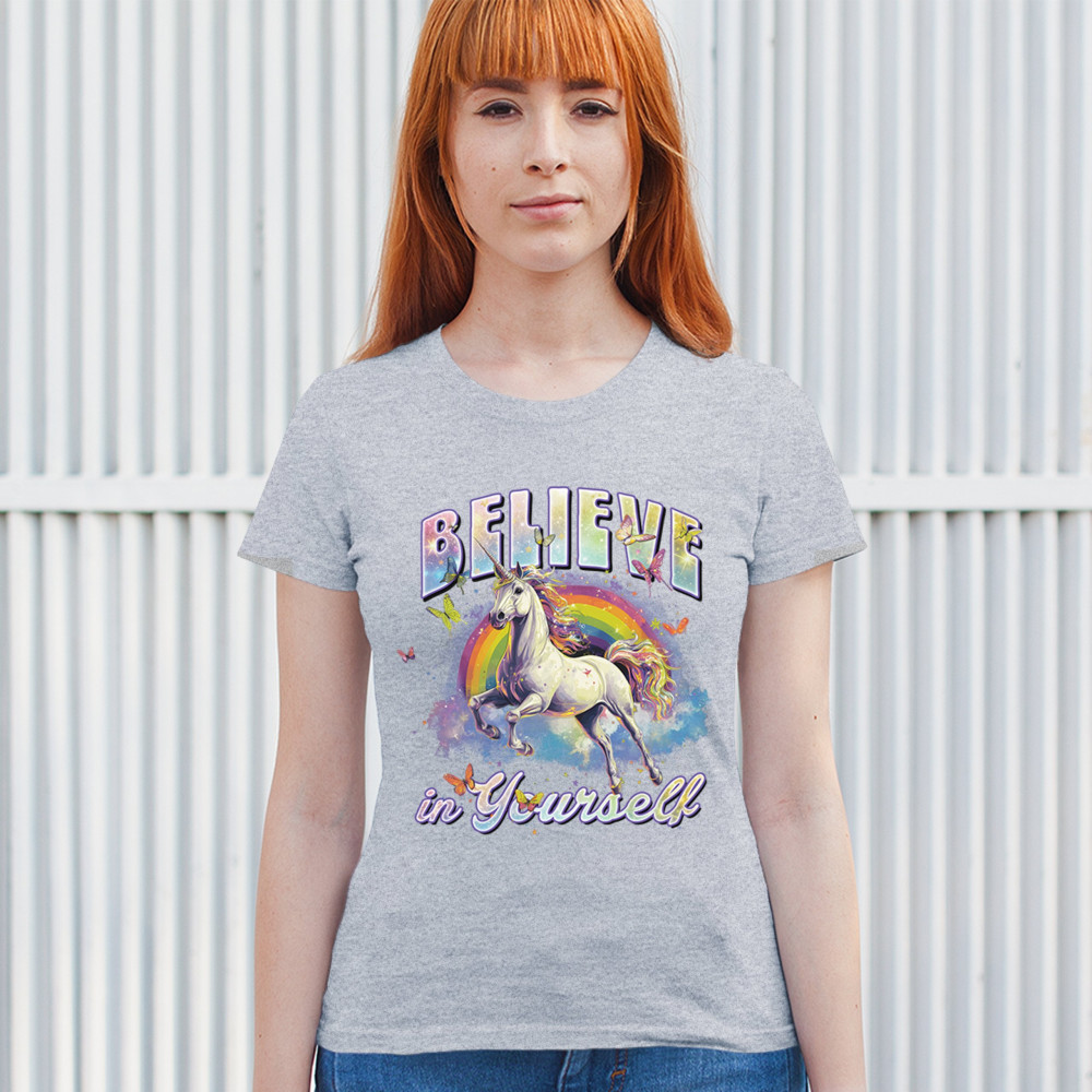 Bring fairytale magic into your everyday life with this Believe in Yourself unicorn rainbow design. Featuring whimsical unicorn shirt details, fantasy rainbow shirt colors, and enchanted unicorn shirt sparkle, it inspires positivity and confidence. A magical rainbow unicorn and galaxy unicorn shirt full of charm, sparkle unicorn shirt vibes, and uplifting energy for all dreamers.