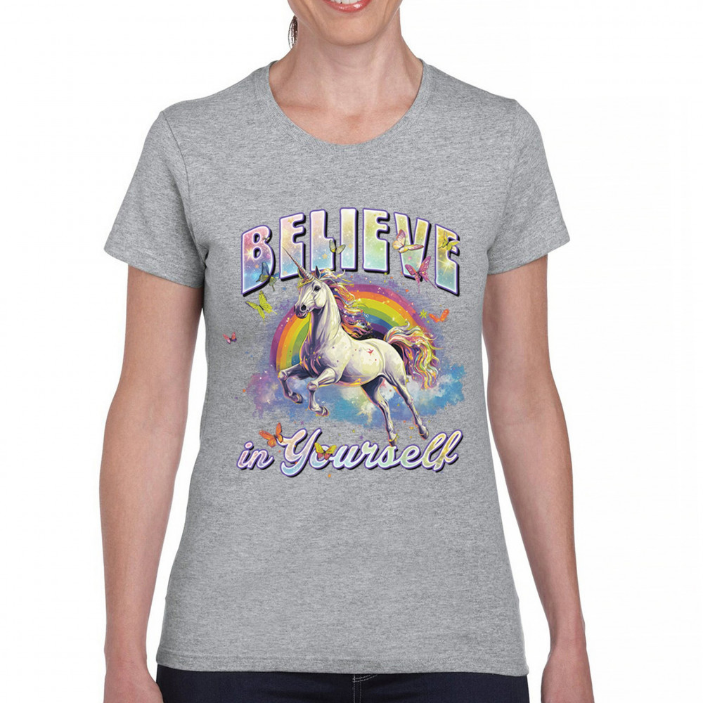 Believe in Yourself unicorn rainbow design with whimsical unicorn shirt, fantasy rainbow style, enchanted unicorn magic, galaxy sparkle, and positivity.