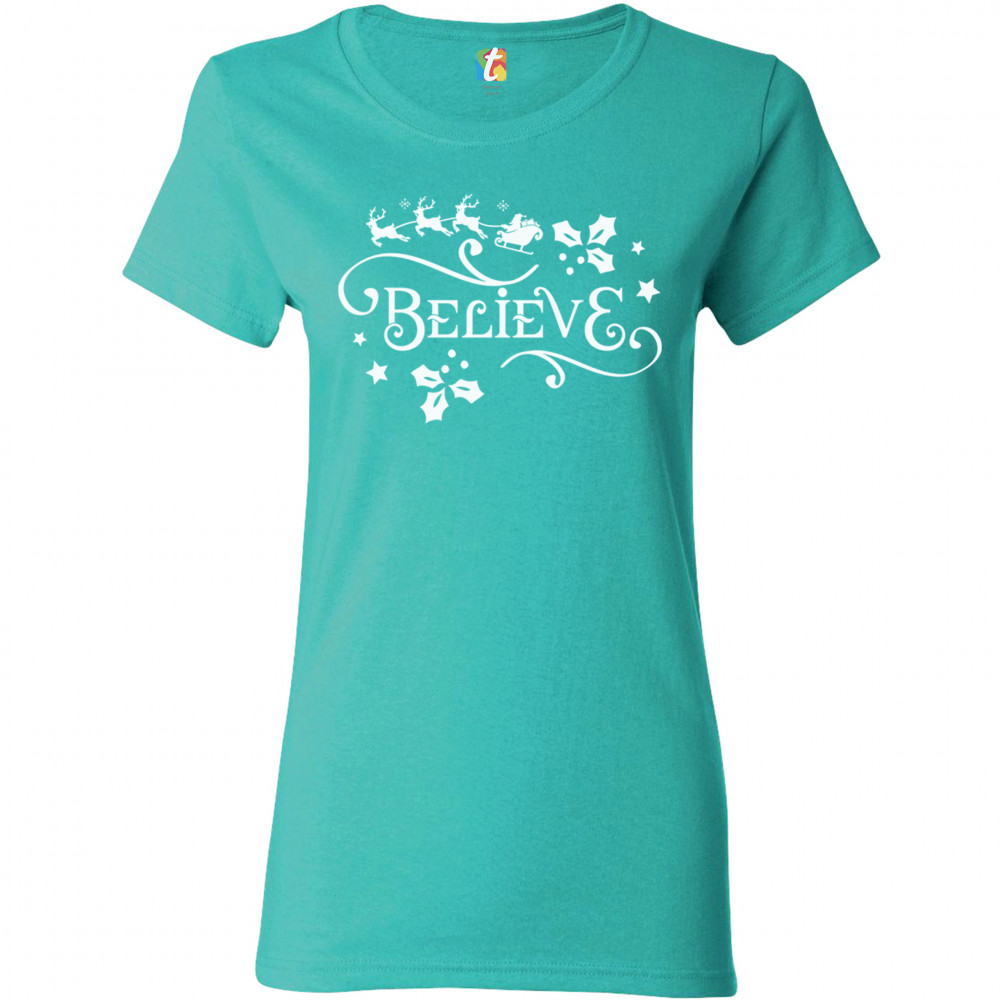 BELIEVE t-shrit merry christmas santa sleigh rudolph mistletoe women's tee light blue
