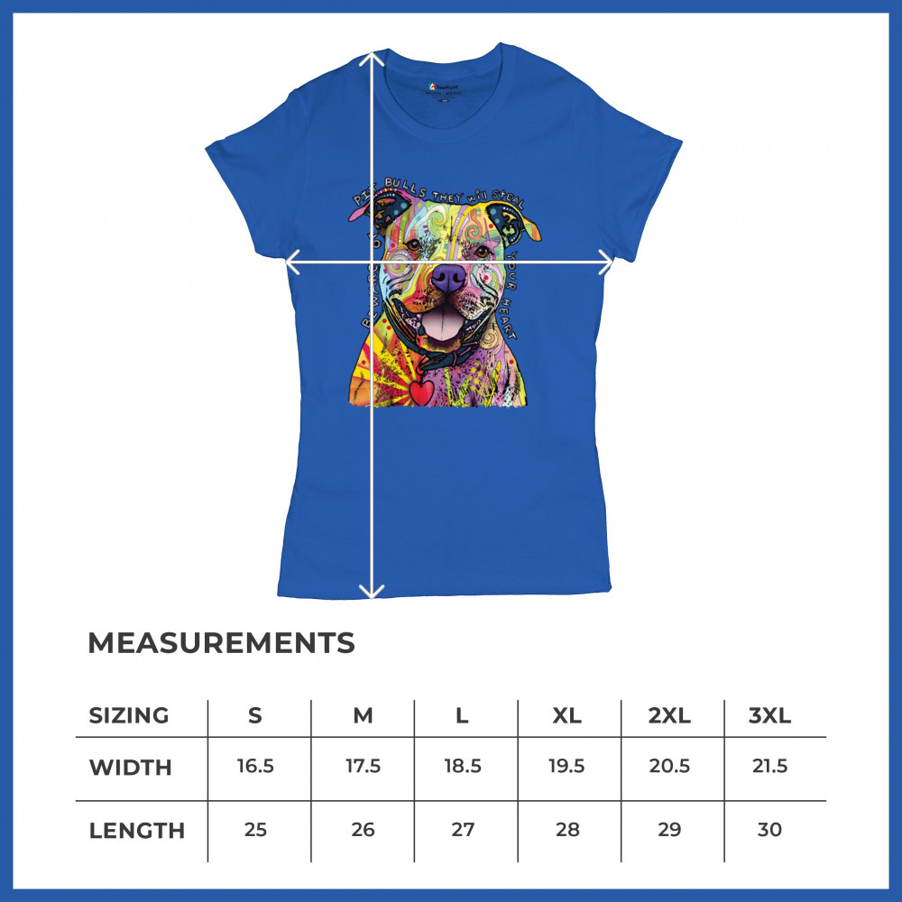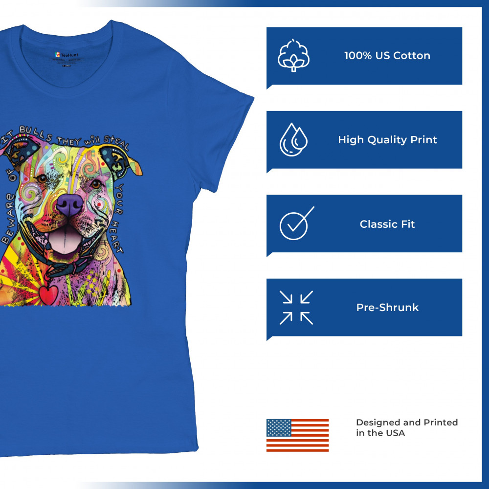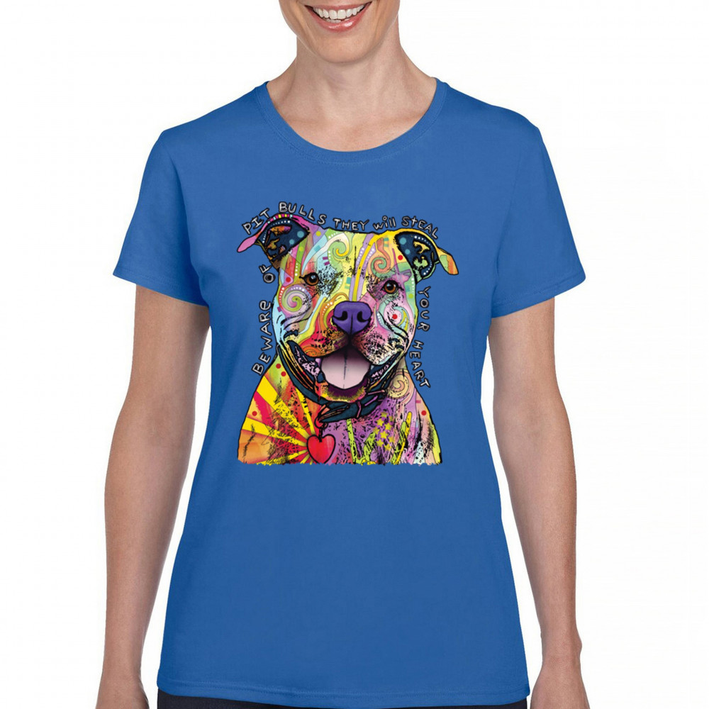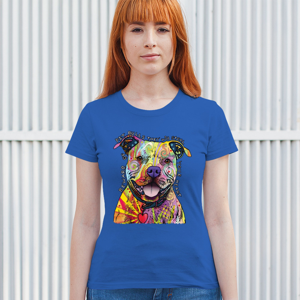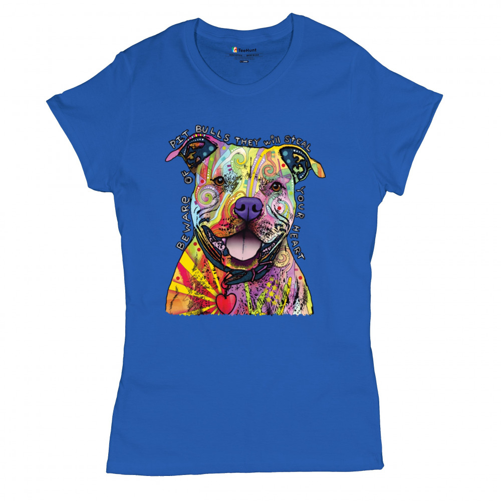 BEWARE OF PIT BULLS t-shirt dean russo art colorful cute dog women's tee royal blue