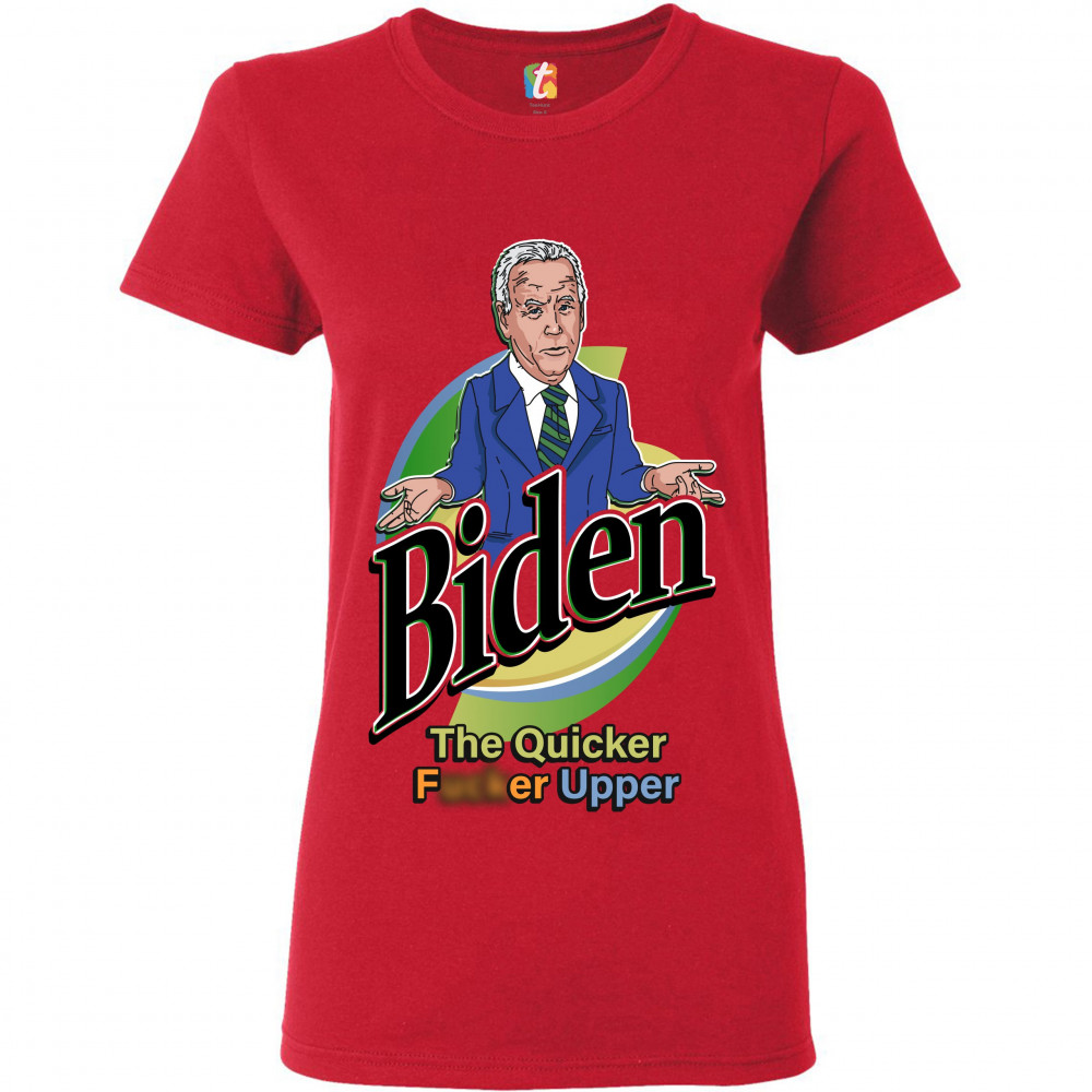 A funny political print featuring a confused Joe Biden shrugging his shoulders and spreading his arms. The print says "Biden the Quicker F*cker Upper". A great choice to wear for a Trump rally or give as a gift to a Donald Trump supporter before 2024 pres