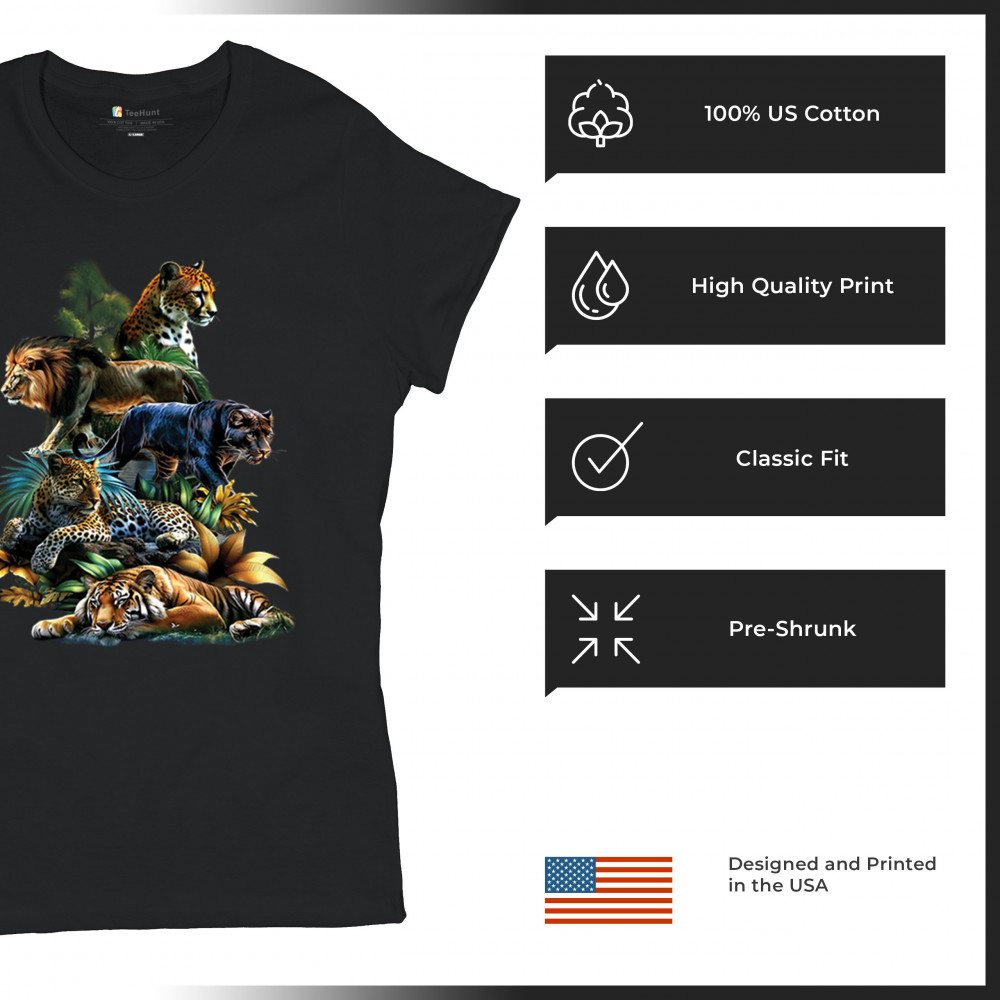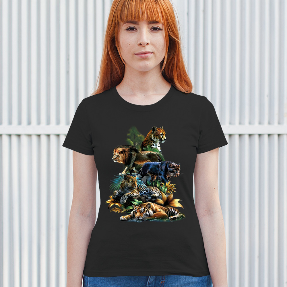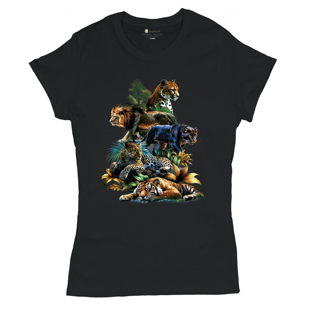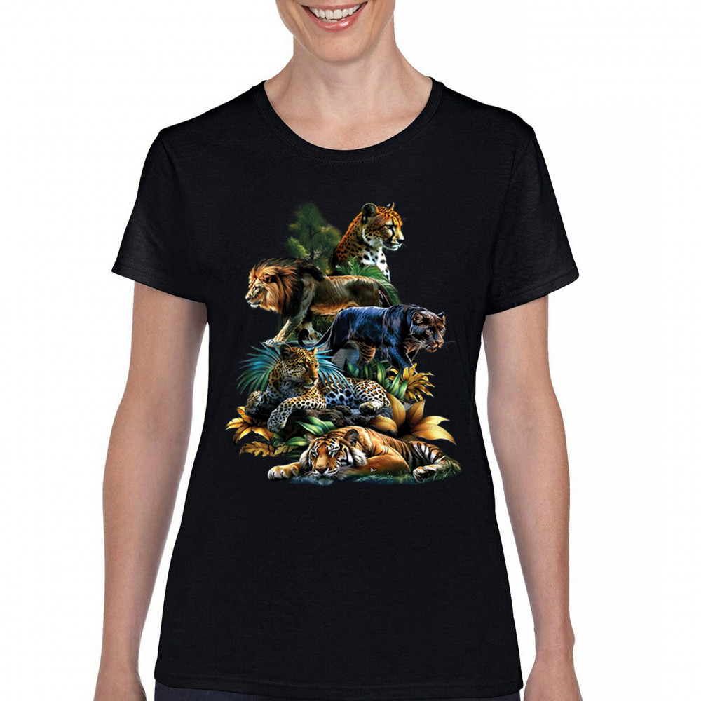 BIG CATS JUNGLE COLLAGE t-shirt lion tiger leopard animal jaguar women's tee black