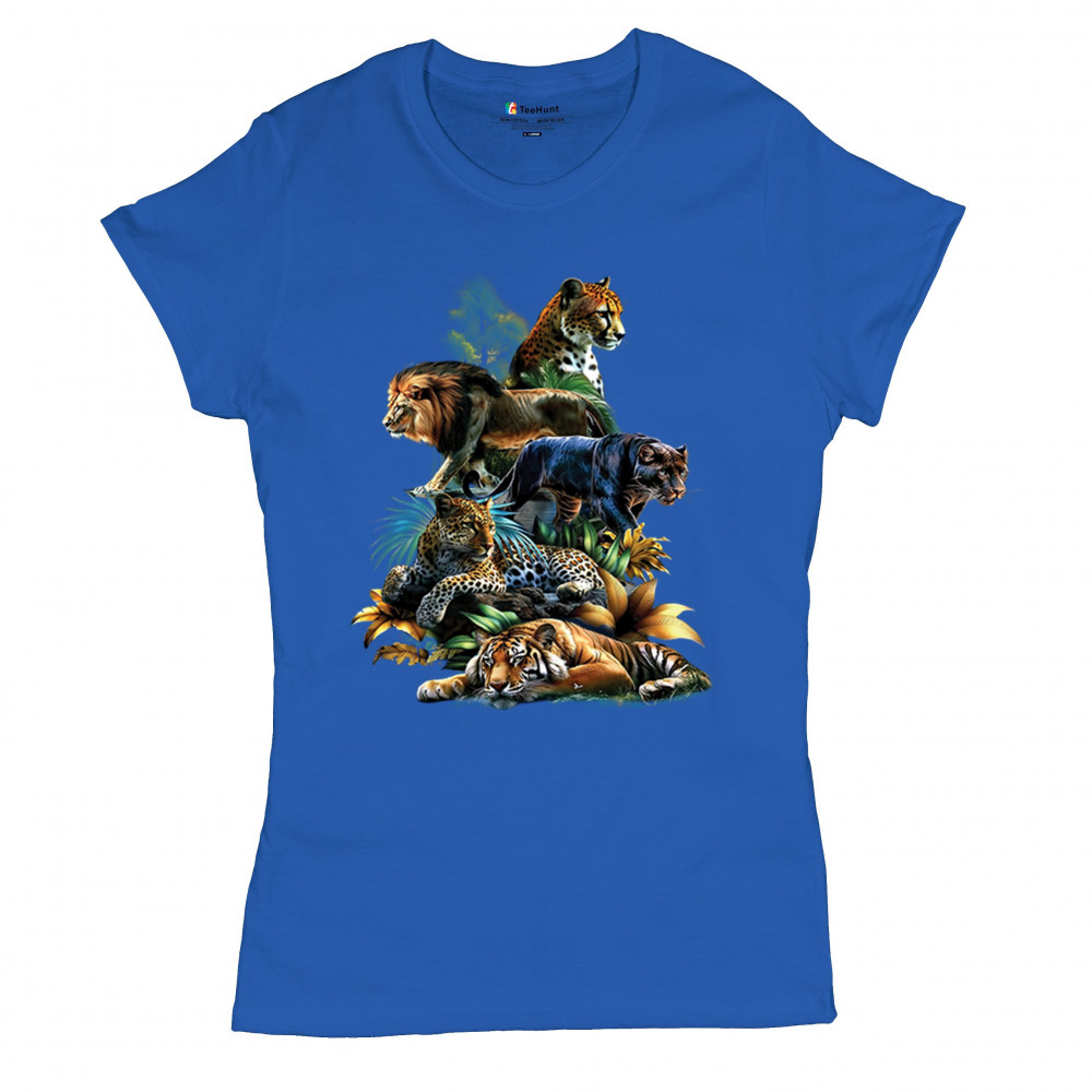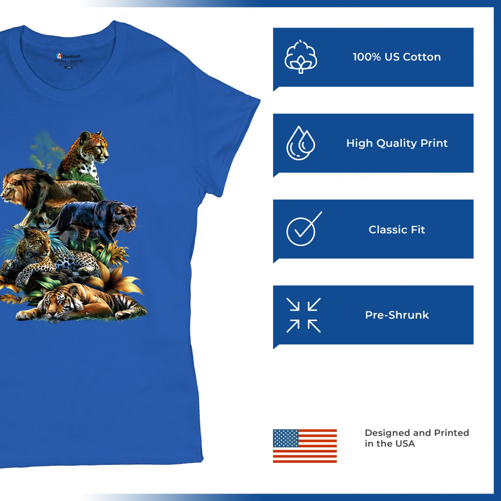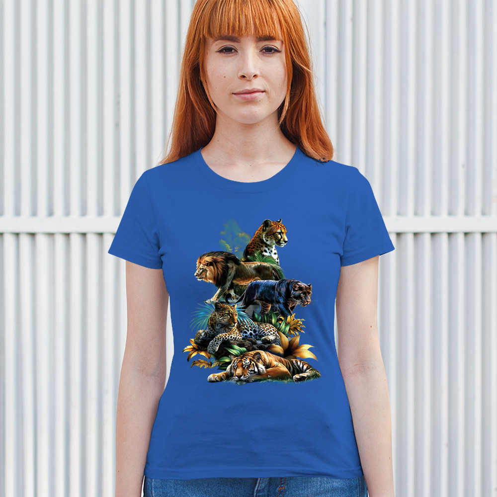 Bold big cat design with lion, tiger, leopard, cheetah, jaguar, and panther. A vivid tribute to wild nature, pride, and animal power.