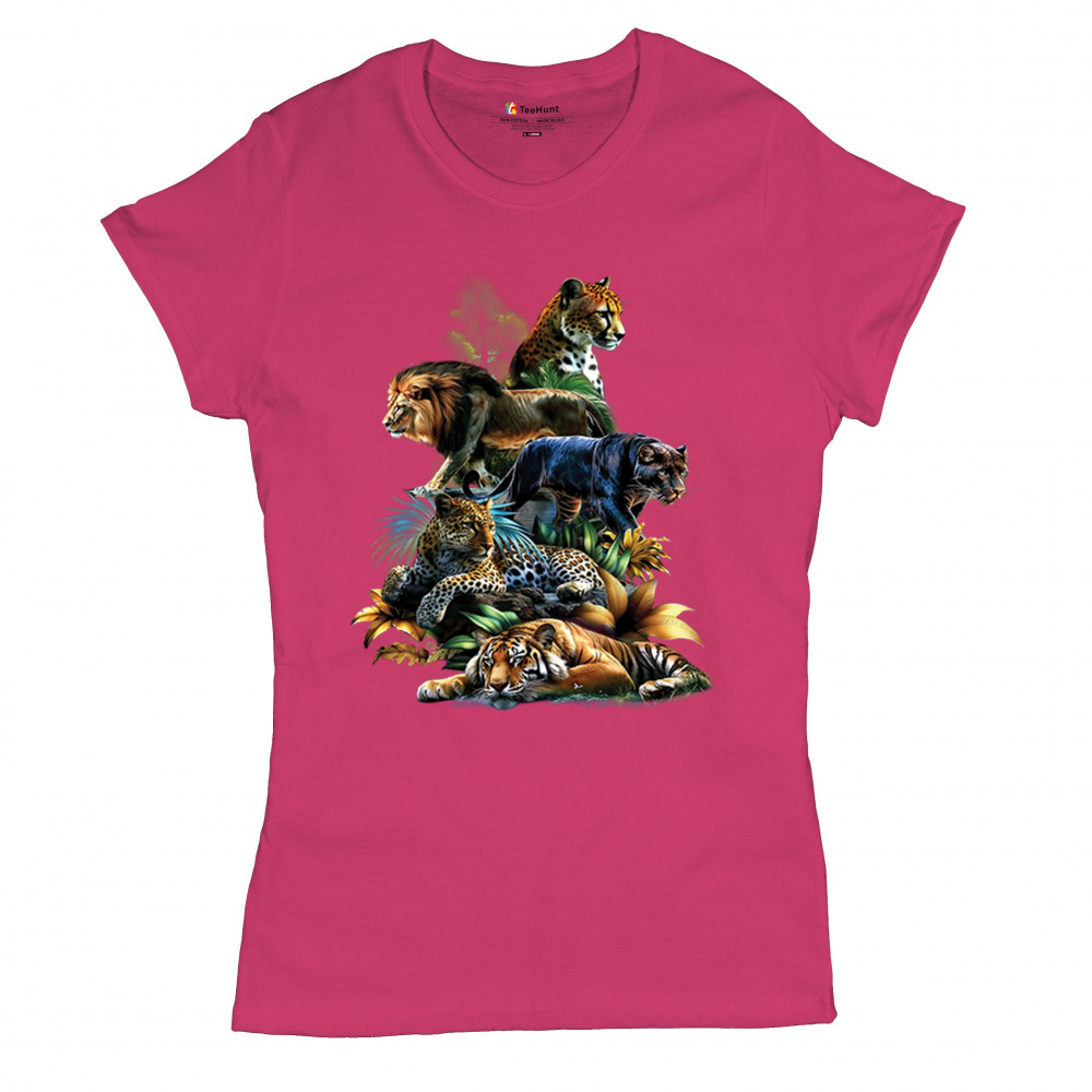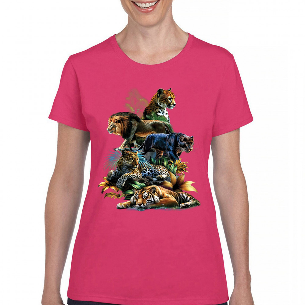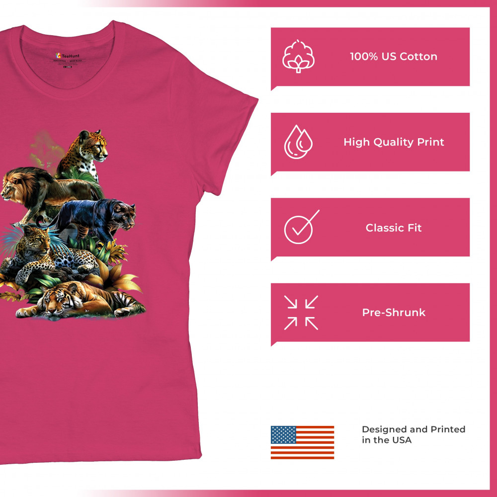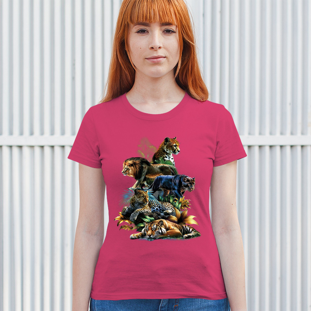 Bold big cat design with lion, tiger, leopard, cheetah, jaguar, and panther. A vivid tribute to wild nature, pride, and animal power.