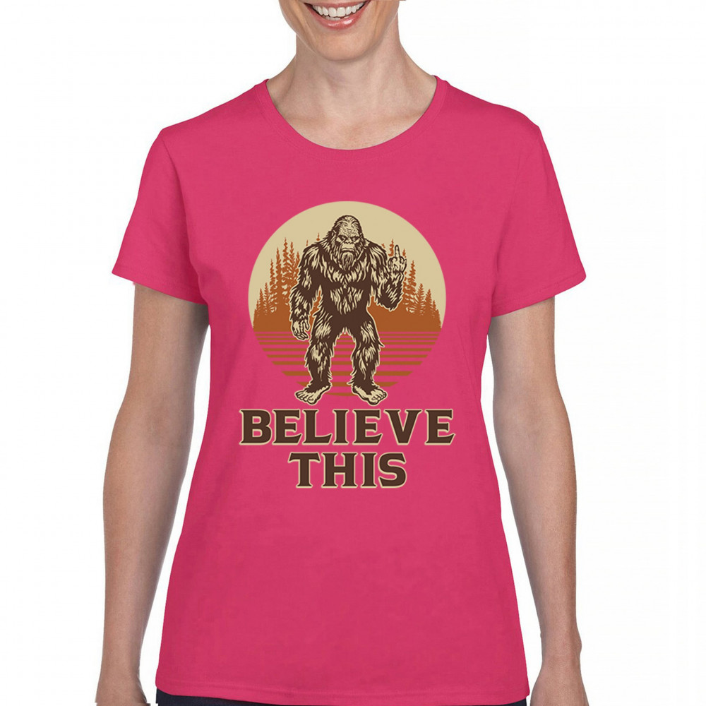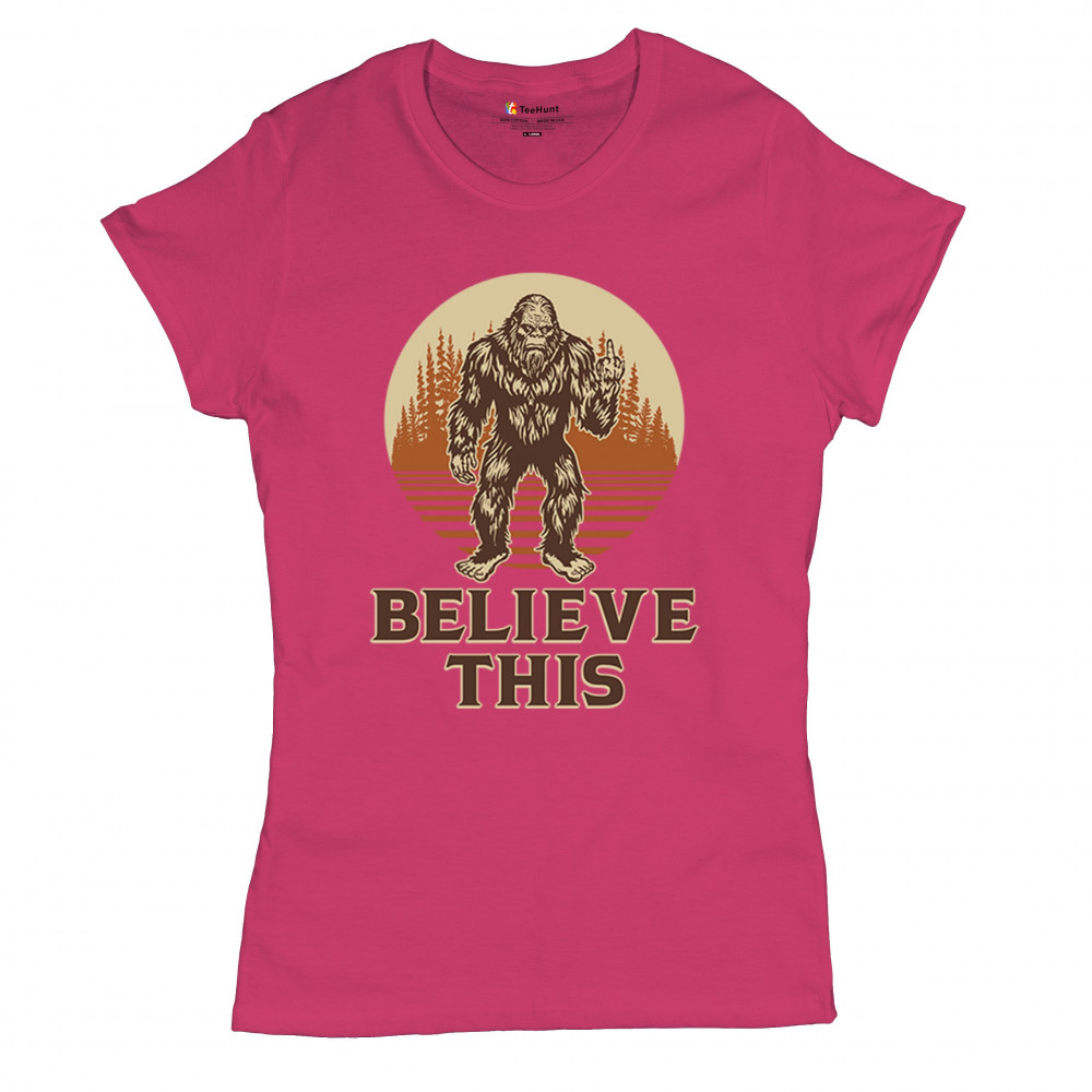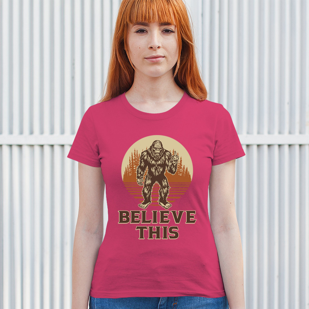 The Believe This Bigfoot design blends cryptid folklore with blunt attitude—because sometimes you just don’t care who believes. Featuring Bigfoot flipping the bird against a rustic tree line, it’s perfect for campers, rebels, and fans of sarcastic forest humor. Ideal for hikes, festivals, and off-grid living.