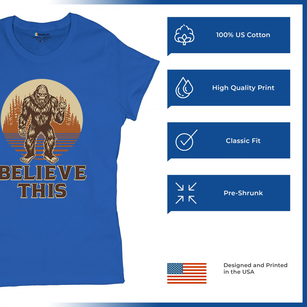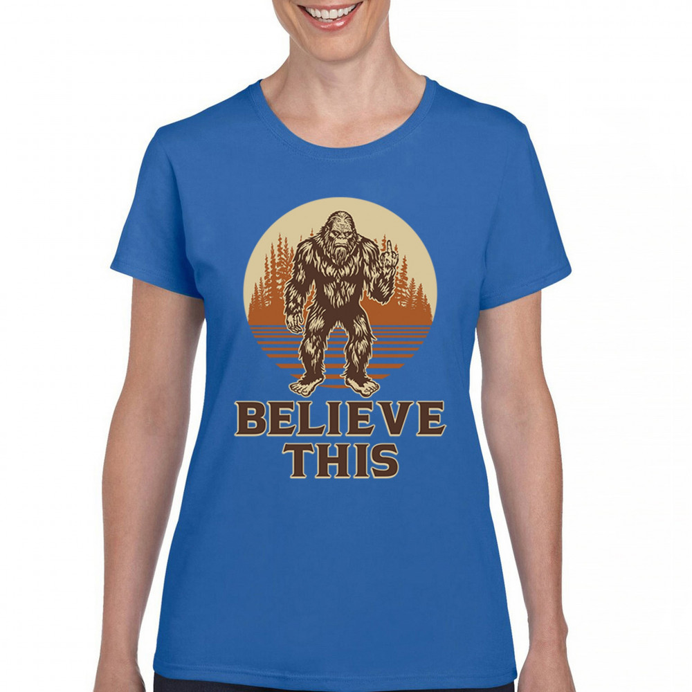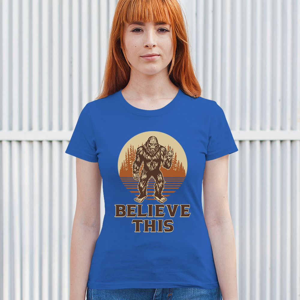 The Believe This Bigfoot design blends cryptid folklore with blunt attitude—because sometimes you just don’t care who believes. Featuring Bigfoot flipping the bird against a rustic tree line, it’s perfect for campers, rebels, and fans of sarcastic forest humor. Ideal for hikes, festivals, and off-grid living.
