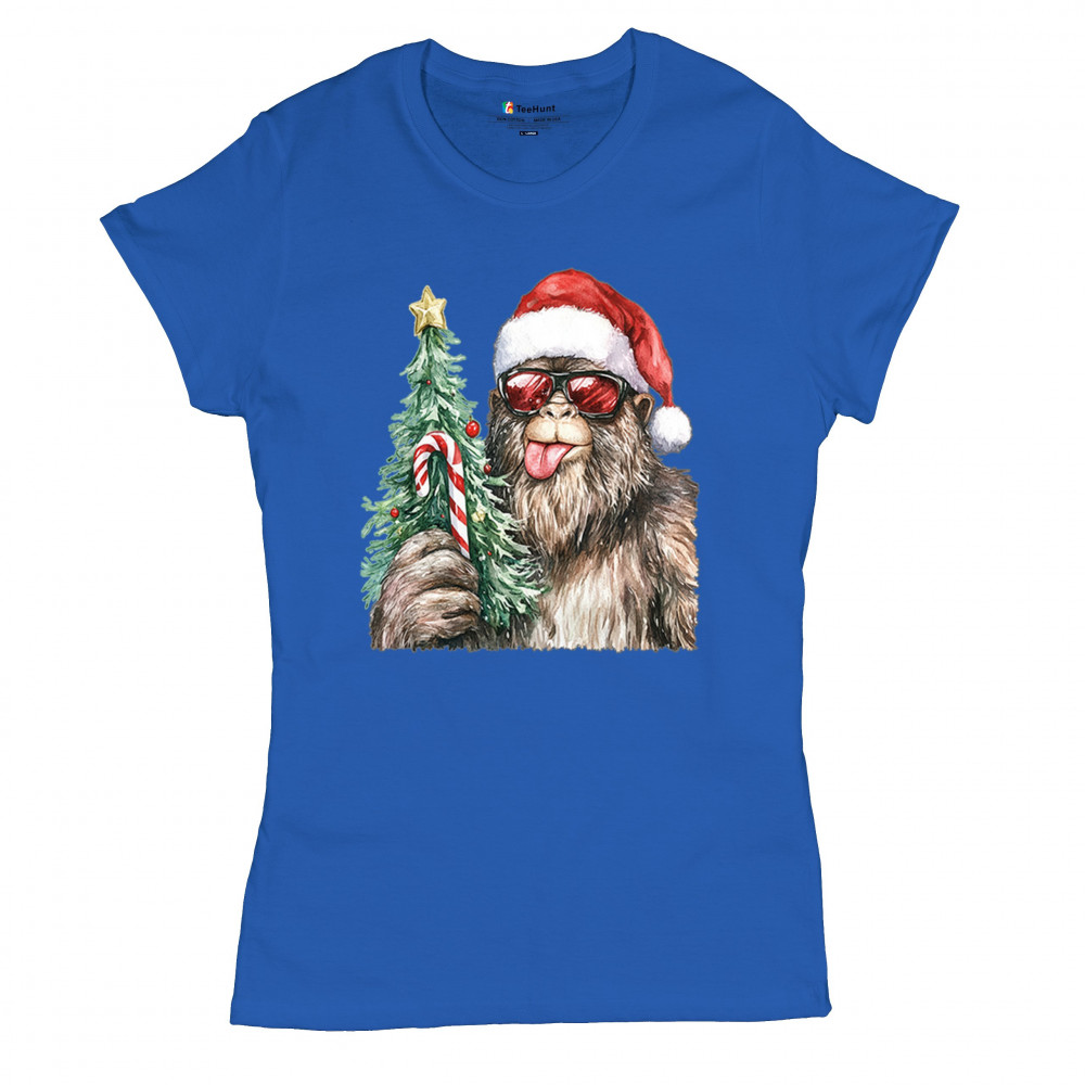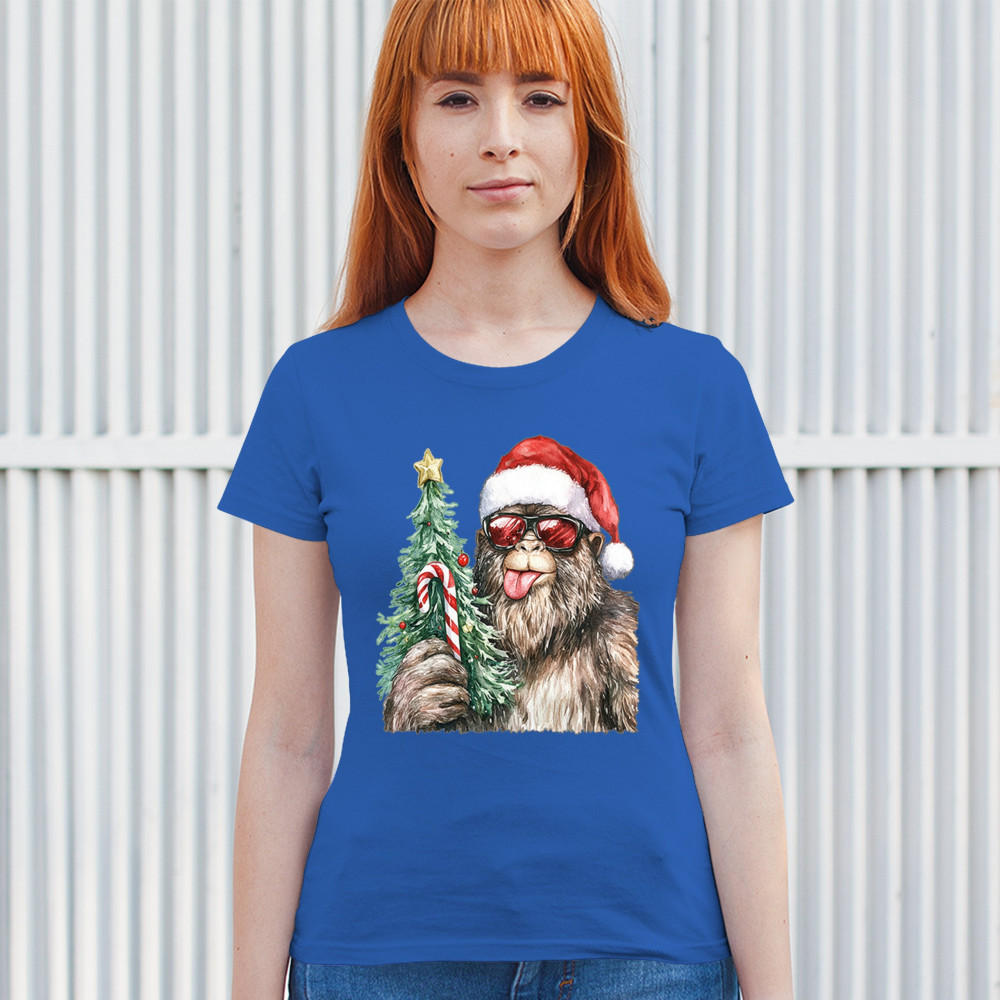 Bigfoot Christmas Santa shirt – festive Sasquatch holiday humor tee with Santa hat design, Xmas tree, candy cane, and funny Christmas style.