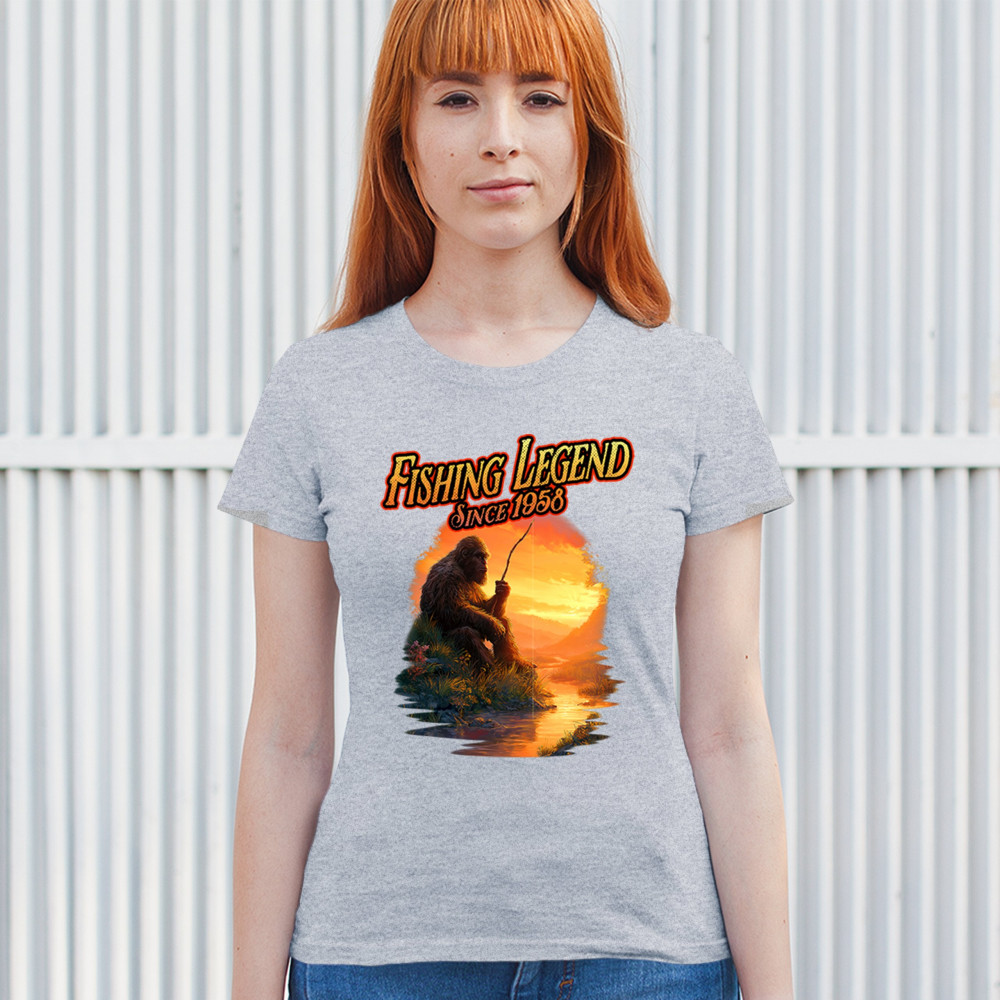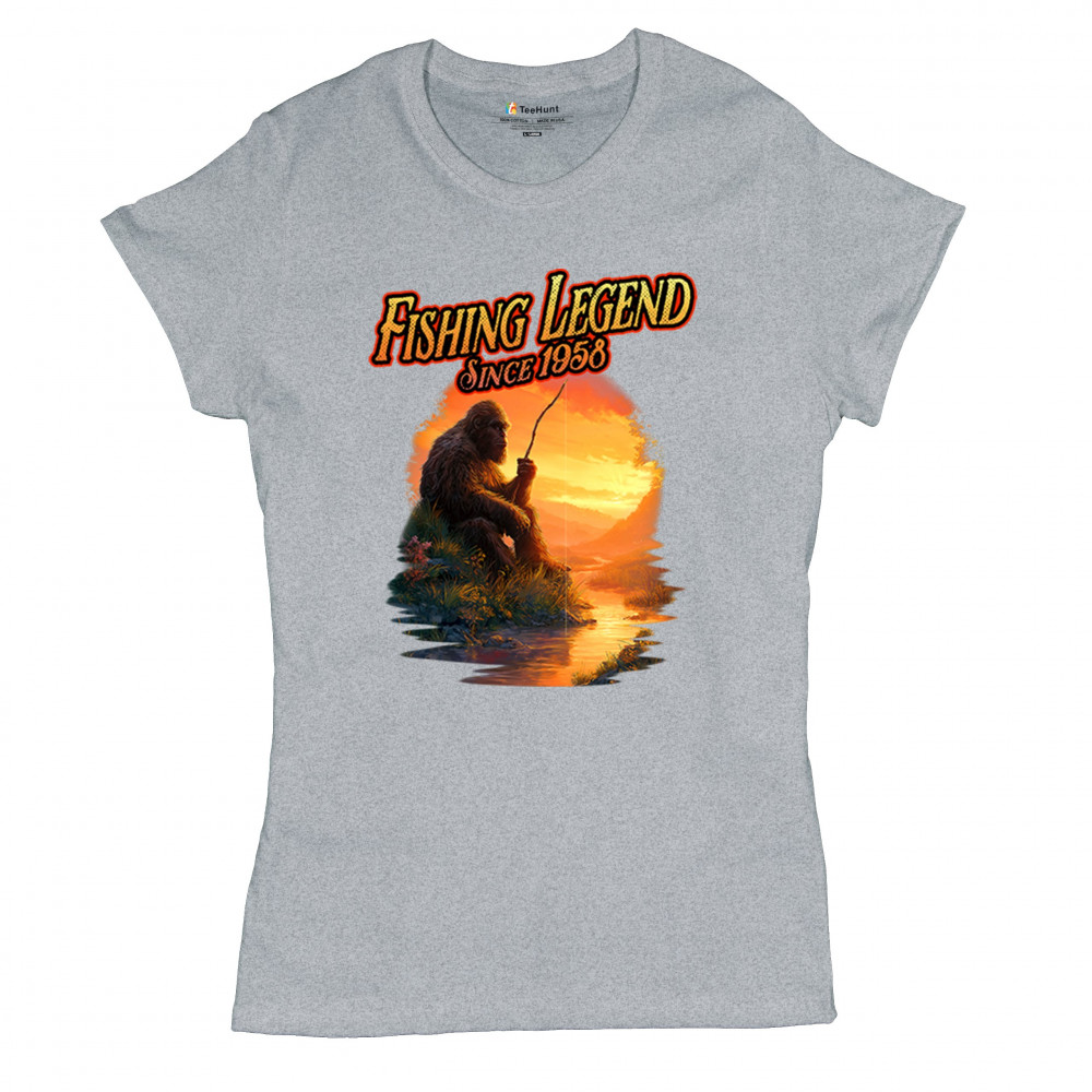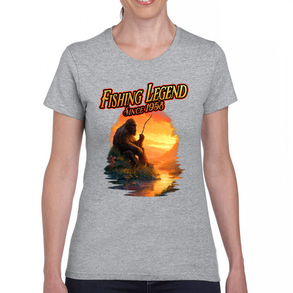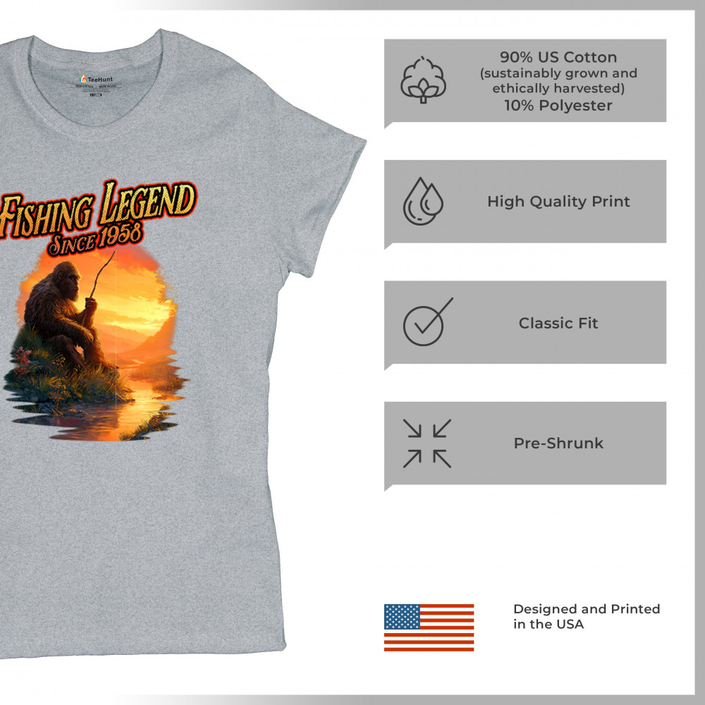 Bigfoot fishing legend design with Sasquatch lifestyle, retro vintage humor, funny wilderness shirt, Father’s Day gift, and campfire style.