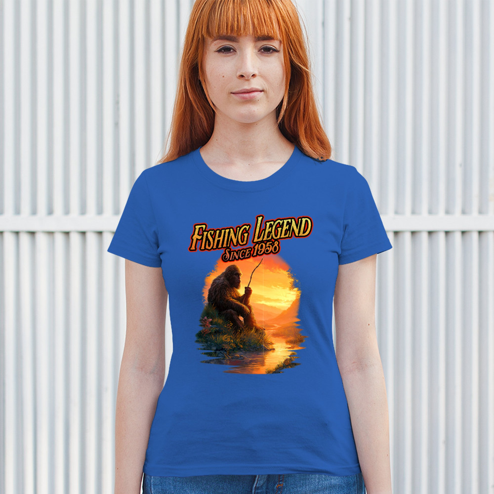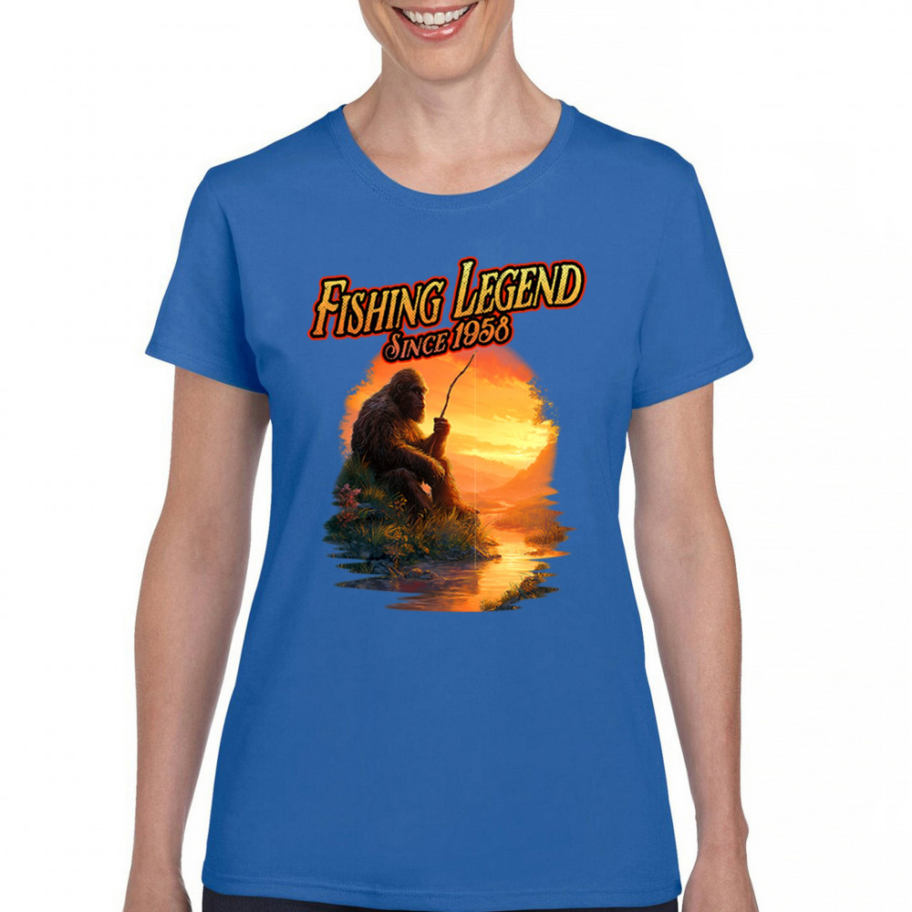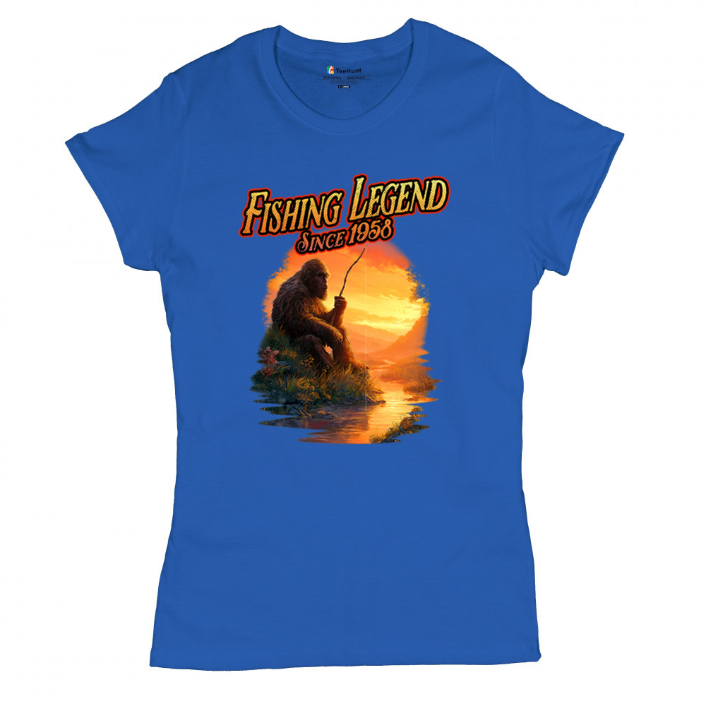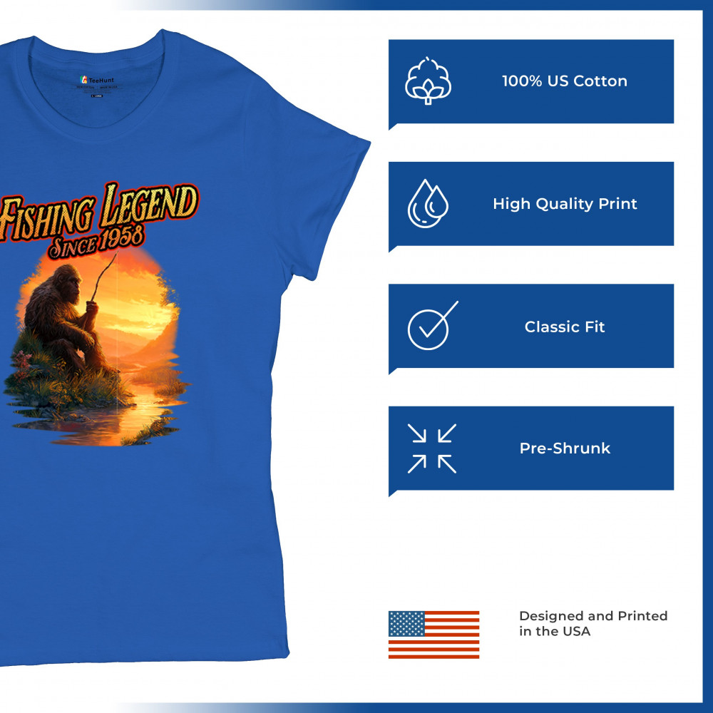 Bigfoot fishing legend design with Sasquatch lifestyle, retro vintage humor, funny wilderness shirt, Father’s Day gift, and campfire style.
