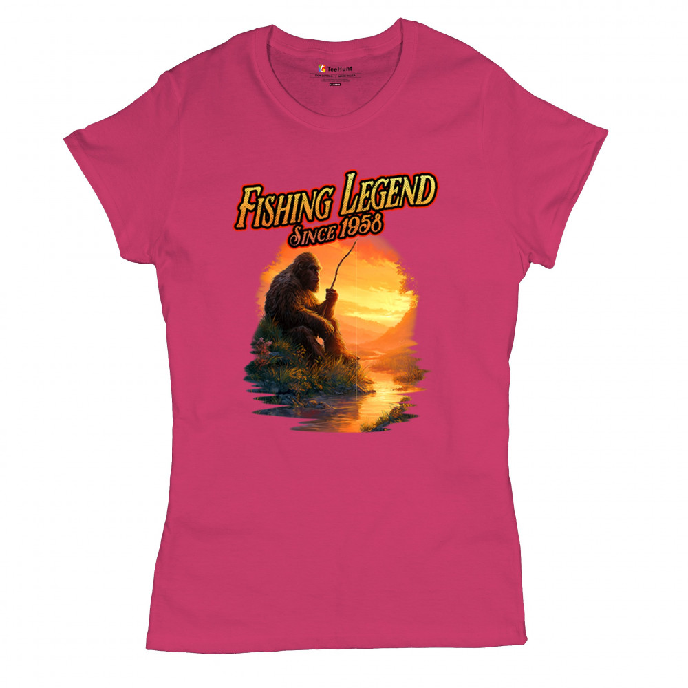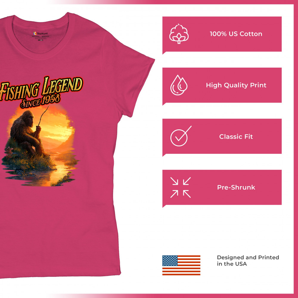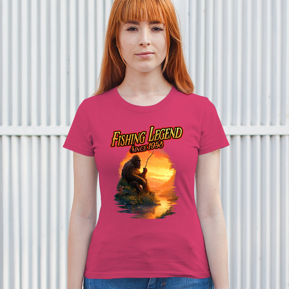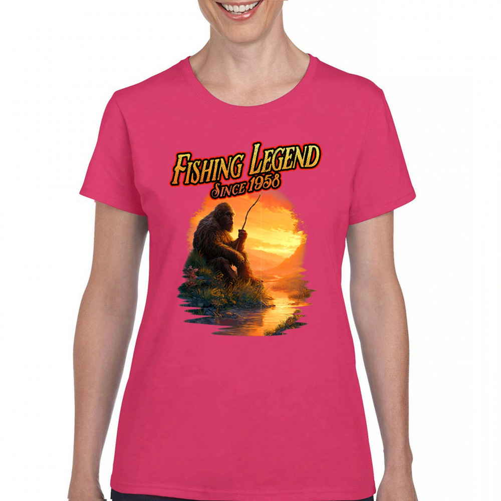 Bigfoot fishing legend design with Sasquatch lifestyle, retro vintage humor, funny wilderness shirt, Father’s Day gift, and campfire style.