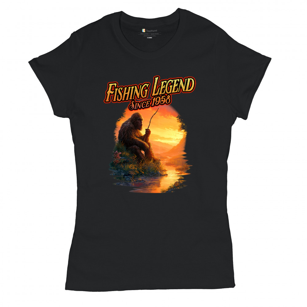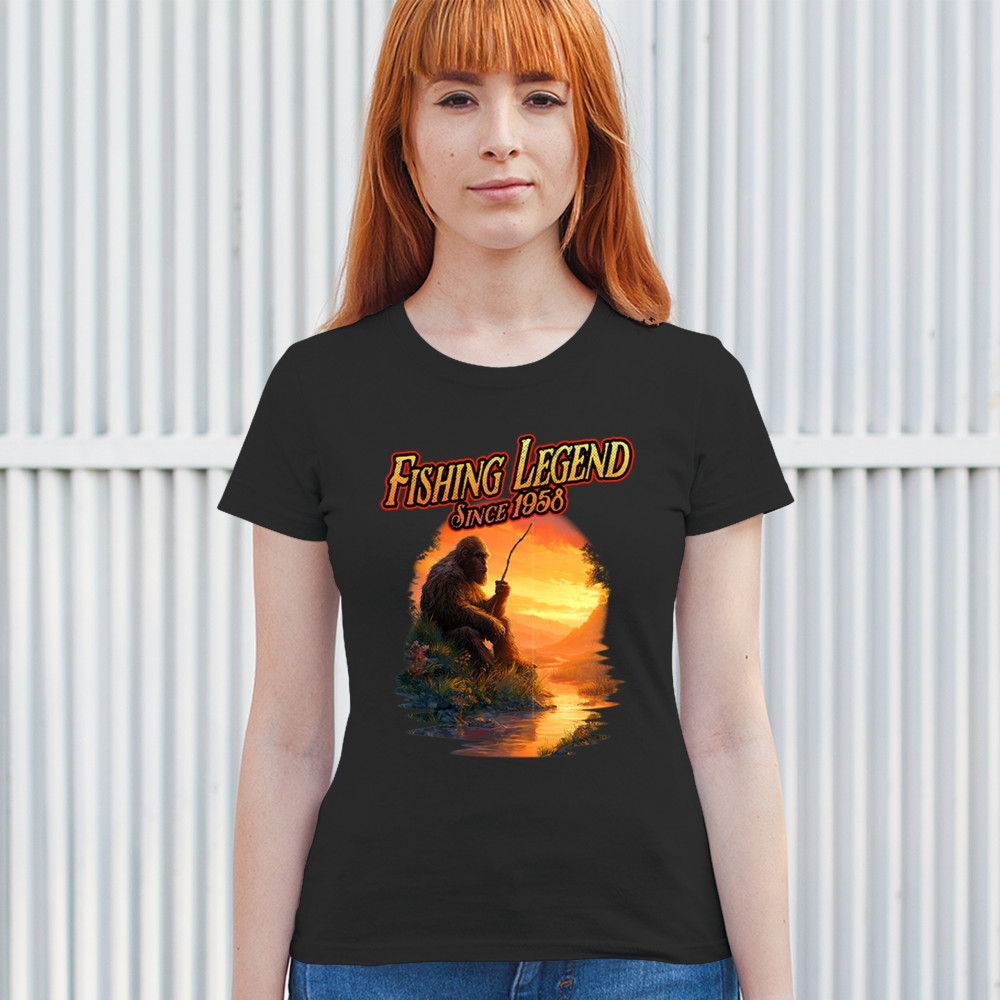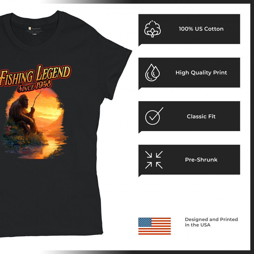 Bigfoot fishing legend design with Sasquatch lifestyle, retro vintage humor, funny wilderness shirt, Father’s Day gift, and campfire style.